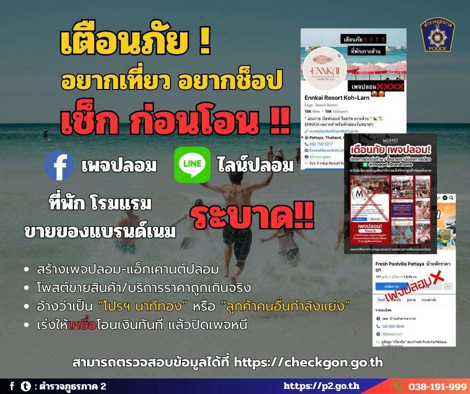 “ก่อนจะเชื่อ ก่อนจะโอน ให้เอะใจเสมอว่าของดี ที่ราคาถูกเกินจริง ถูกจนน่าตกใจ ไม่มีจริง และอาจเป็นหลุมพรางที่มิจฉาชีพเอาไว้ล่อเหยื่อ และหากพบเห็นเพจเฟซบุ๊ก หรือแพลตฟอร์มโซเชียลมีเดียใด ๆ ทำปลอม หลอกลวงให้กดรีพอร์ต หรือแจ้งที่สายด่วน 1441 ทั้งนี้นอกจากที่พัก หรือบริการเกี่ยวกับการท่องเที่ยวแล้ว สินค้า เครื่องประดับ โทรศัพท์มือถือ ไอแพด สินค้าแบรนด์เนม นาฬิกา พระเครื่อง เป็นสินค้าที่มิจฉาชีพมักหลอกขายทางออนไลน์ ทั้งในรูปแบบของปลอมแล้วบอกว่าแท้ หรือหลอกขายสินค้าที่ไม่มีอยู่จริง ซึ่งกลลวงแบบนี้ยังไม่หมด ขอให้ช็อปปิงออนไลน์อย่างระมัดระวัง ไม่เชื่อ ไม่รีบ ไม่โอน” ผบช.ภ.2 กล่าว