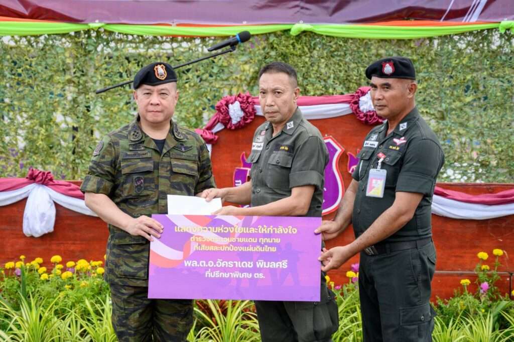 ในการนี้ ได้ตรวจเยี่ยมสร้างขวัญกำลังใจให้กับข้าราชการตำรวจ กก.ตชด.22 และมอบเงินบำรุงขวัญให้กับข้าราชการตำรวจที่ได้รับบาดเจ็บจากการปฏิบัติหน้าที่สู้รบตามแนวชายแดนไทย-กัมพูชา จำนวน 16 นาย รวมเป็นเงิน 64,000 บาท พร้อมมอบเงินให้กับหน่วยฯ จำนวน 40,000 บาท และสิ่งของอุปโภคบริโภคจากของ ตร. และภาคเอกชน ประกอบด้วย น้ำดื่ม จำนวน 100 แพ็ค ข้าวสาร ถุงละ 3 กิโลกรัม จำนวน 600 ถุง บะหมี่กึ่งสำเร็จรูป 60 ลัง ปลากระป๋อง 200แพ็ค (20ลัง) นมกล่อง ยี่ห้อแล็คตาซอย 30 ลัง พัดลม 30 ต้ว แป้งโยคี 50 แพ็ค หน้ากากอนามัย 2 ลัง 80 กล่อง ยาดม 20 แพ็ค ขนมปังยูโร่เค้ก 10 ลัง เนสกาแฟ 20 แพ็ค (แพ็คละ 60ซอง) ผ้าอนามัย 20 แพ็ค ไข่เค็ม 30 แผง