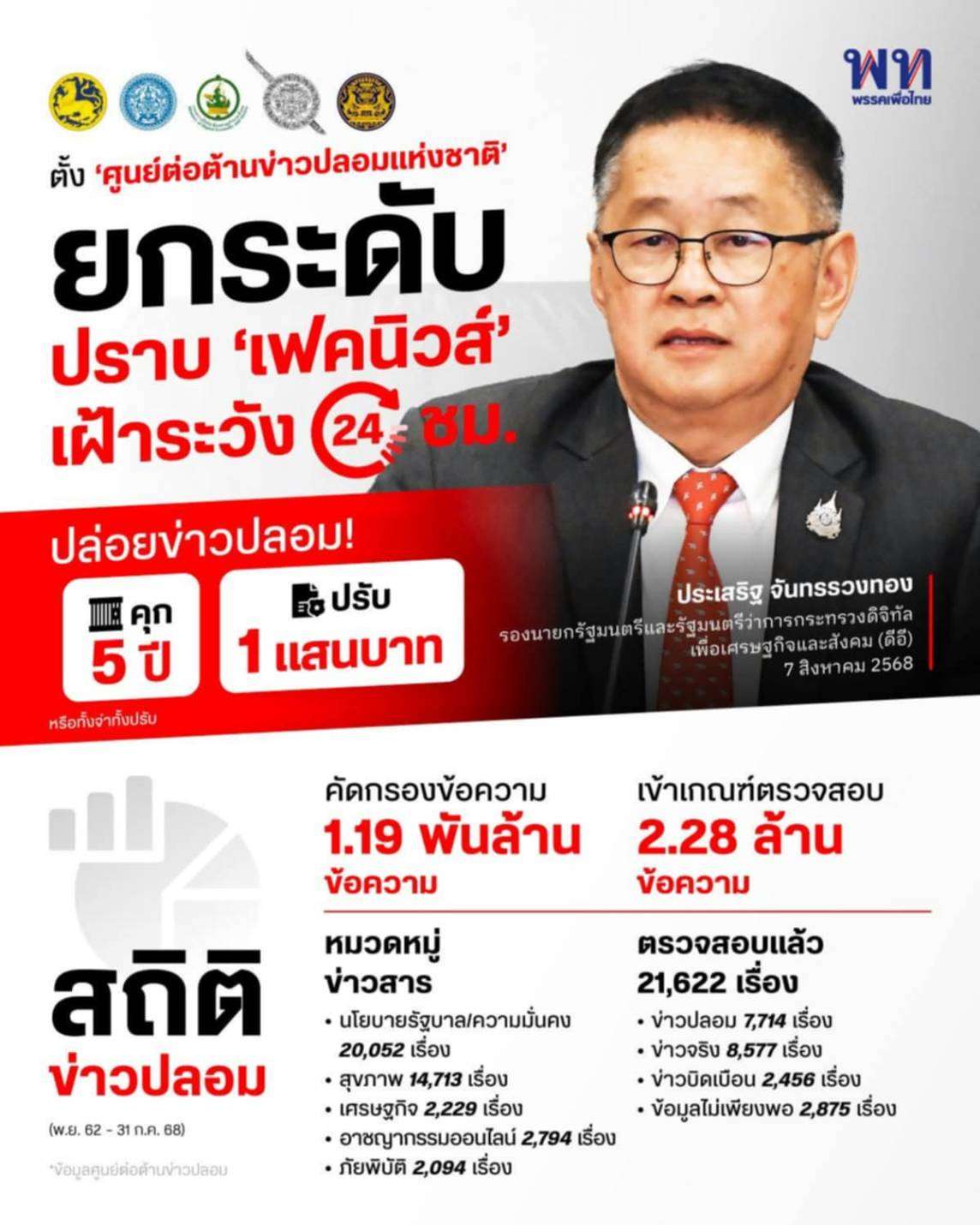 นายประเสริฐ จันทรรวงทอง รองนายกรัฐมนตรี ยกระดับปราบ ‘เฟคนิวส์’ ตั้ง ‘ศูนย์ต่อต้านข่าวปลอมแห่งชาติ’บูรณาการการทำงานร่วมกับ ‘มหาดไทย – กต. – สมช. – ตร.-หน่วยงานด้านความมั่นคง’ ลุยปิดกั้นการเผยแพร่ข้อมูลเท็จ