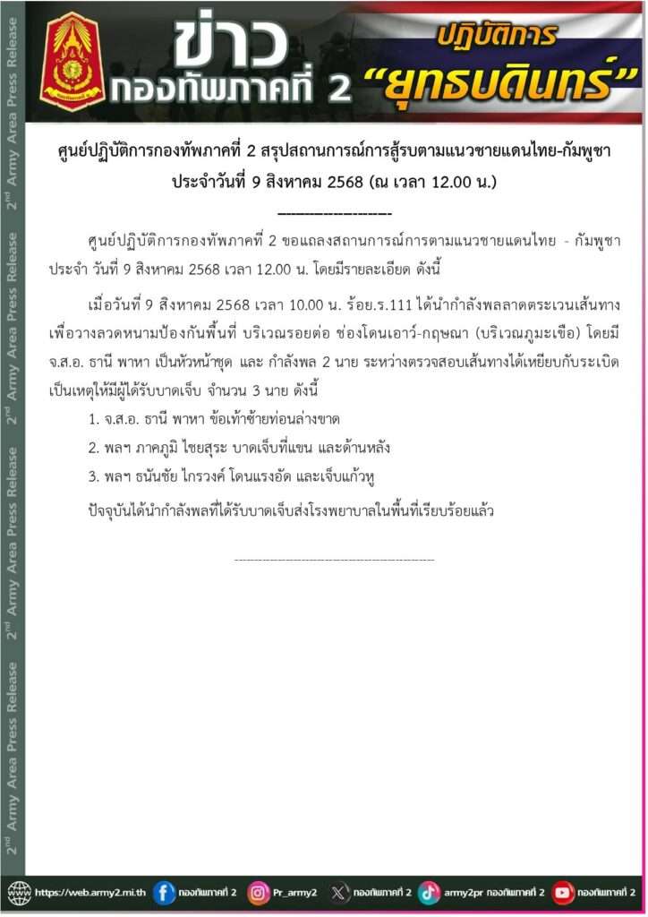 เพจเฟซบุ๊ก กองทัพภาคที่ 2 รายงานว่า ศูนย์ปฏิบัติการกองทัพภาคที่ 2 ขอแถลงสถานการณ์การตามแนวชายแดนไทย – กัมพูชา ประจำวันที่วันที่ 9 สิงหาคม 2568 ถึงเวลา 11.00 น. โดยมีรายละเอียด ดังนี้ เมื่อวันที่ 9 สิงหาคม 2568 เวลา 10.00 น. ร้อย.ร.111 ได้นำกำลังพลลาดตระเวนเส้นทางเพื่อวางลวดหนามป้องกันพื้นที่ บริเวณรอยต่อ ช่องโดนเอาว์-กฤษณา (บริเวณภูมะเขือ) โดยมี จ.ส.อ. ธานี พาหา เป็นหัวหน้าชุด และกำลังพล 2 นาย โดยระหว่างตรวจสอบเส้นทางได้เหยียบกับระเบิด เป็นเหตุให้มีผู้ได้รับบาดเจ็บ จำนวน 3 นาย (ส.1 พ.2) ดังนี้