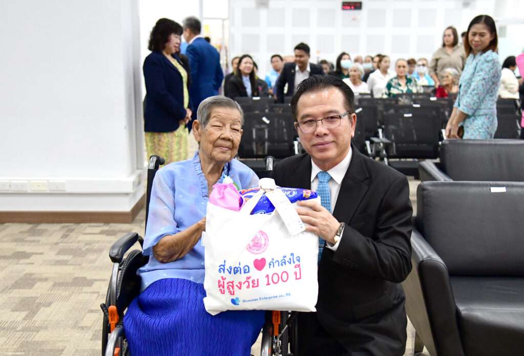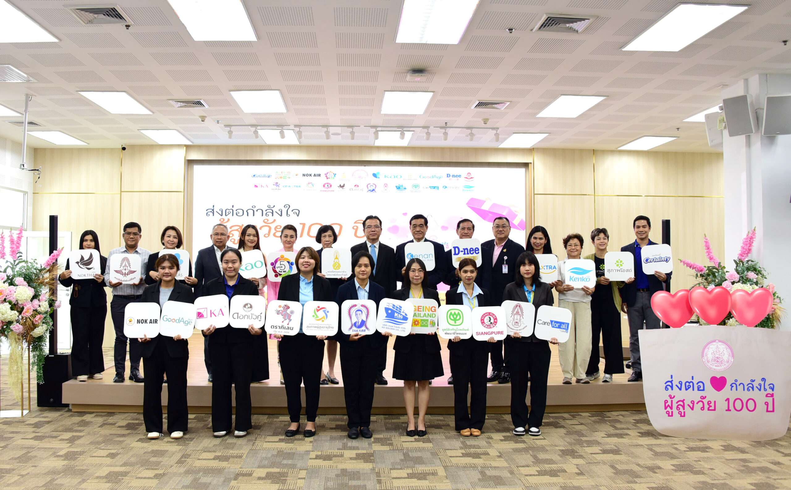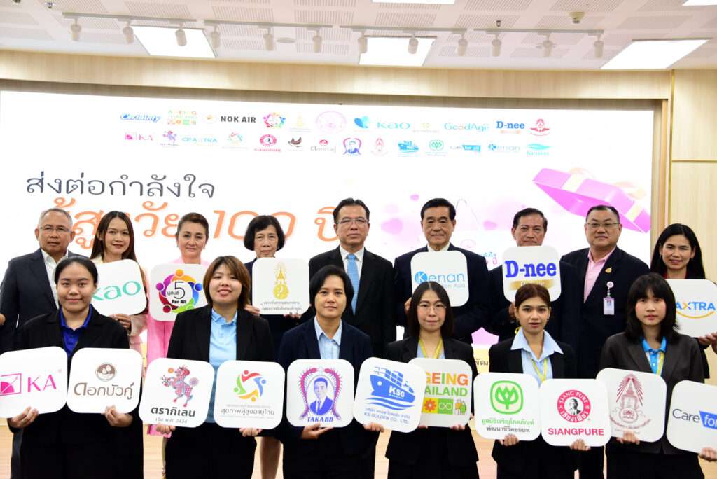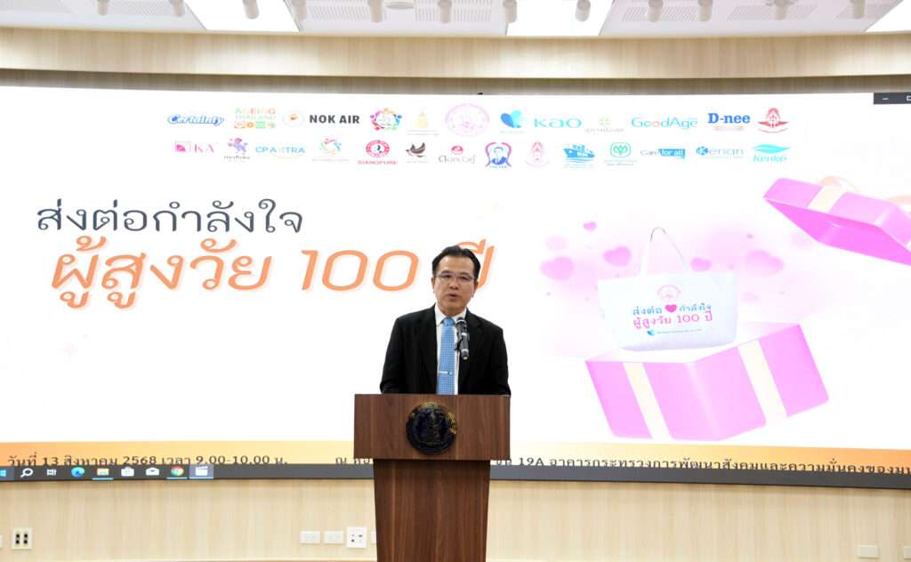 ที่กระทรวงการพัฒนาสังคมและความมั่นคงของมนุษย์ (พม.) วันที่ 13 สิงหาคม – นายธนสุนทร สว่างสาลี อธิบดีกรมกิจการผู้สูงอายุ แถลงข่าว “กิจกรรมส่งต่อกำลังใจ ผู้สูงวัย 100 ปี”เพื่อเชิดชูเกียรติและให้กำลังใจแก่ผู้สูงอายุที่มีอายุครบ 100 ปีขึ้นไป โดยมี นางพรนิภา มาสิลีรังสี นางวาสนา ทองจันทร์ รองอธิบดีกรมกิจการผู้สูงอายุ พร้อมด้วยพันธมิตร อาทิ นางสาวกอบกุล กวั่งซ้วน ผู้เชี่ยวชาญเฉพาะด้านผู้สูงอายุ บริษัท คาโอ อินดัสเตรียล (ประเทศไทย) จำกัด มูลนิธิทันตนวัตกรรม ในพระบรมราชูปถัมภ์ บริษัท สายการบินนกแอร์ จำกัด (มหาชน) มูลนิธิ Five for All มูลนิธิคีนันแห่งเอเซีย บริษัท ซีพี แอ็กซ์ตร้า จำกัด (มหาชน) มูลนิธิเจริญโภคภัณฑ์พัฒนาชีวิตชนบท การรถไฟแห่งประเทศไทย สภาสังคมสงเคราะห์แห่งประเทศไทย ในพระบรมราชูปถัมภ์ สมาคมการค้าและการบริการสุขภาพผู้สูงอายุไทย เข้าร่วมงาน