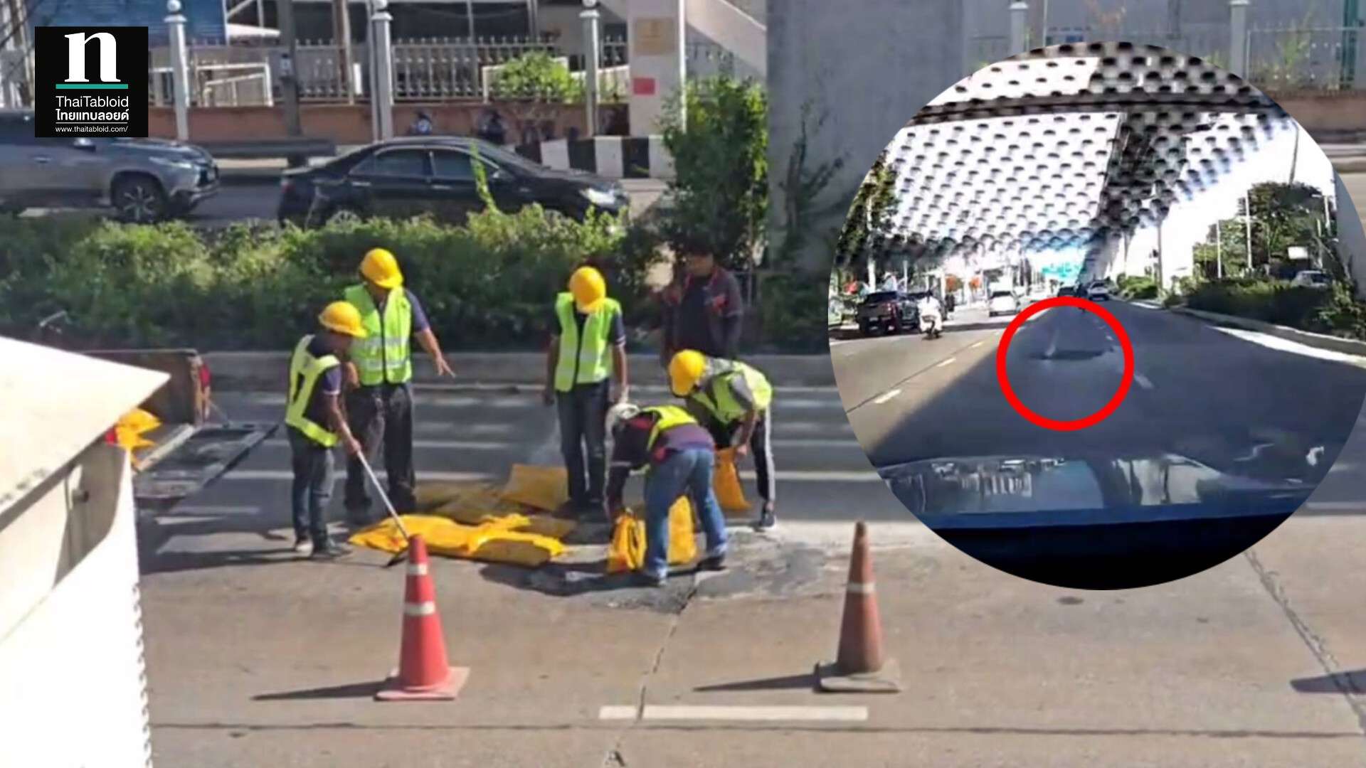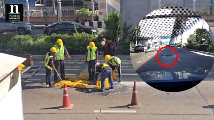 เมื่อวันที่ 14 ส.ค. 68 ผู้สื่อข่าวเดินทางลงพื้นที่บริเวณถ.แจ้งวัฒนะ (ขาออก) มุ่งหน้าห้าแยกปากเกร็ด หน้าห้างบิ๊กซี เอ็กซ์ตร้า สาขาแจ้งวัฒนะ 2 ต.ปากเกร็ด อ.ปากเกร็ด จ.นนทบุรี ซึ่งเป็นถนน 4 เลน บริเวณช่องทางเลนที่ 3 มีถนนยุบตัวลงและมีรอยแตก ทรุดเป็นแอ่งประมาณ 20 ซม. ซึ่งบริเวณนี้มีรถสัญจรไป-มา ผ่านตลอดเวลา จากการตรวจสอบเบื้องต้น พบรถยนต์ได้รับความเสียหาย ยางแตกจำนวนกว่า 10 คัน