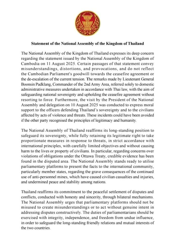 สำนักประชาสัมพันธ์ สำนักงานเลขาธิการสภาผู้แทนราษฎร เผยแพร่แถลงการณ์ของรัฐสภาแห่งราชอาณาจักรไทย ใจความว่า รัฐสภาแห่งราชอาณาจักรไทย มีความห่วงกังวลต่อถ้อยแถลงของรัฐสภาแห่งราชอาณาจักรกัมพูชา เมื่อวันที่ 11 สิงหาคม พ.ศ. 2568 ซึ่งมีถ้อยความบางส่วนที่แสดงถึงความเข้าใจที่ผิดพลาด บิดเบือน ยั่วยุ และไม่สะท้อนถึงความมุ่งหวังที่ดีของรัฐสภากัมพูชาต่อข้อตกลงหยุดยิงและการทุเลาสถานการณ์ความตึงเครียดในปัจจุบัน ถ้อยคำของพลโท บุญสิน พาดกลาง ผู้บัญชาการกองทัพภาคที่ 2 เป็นการกล่าวถึงการบริหารจัดการภายในประเทศตามกฎหมายไทย เพื่อรักษาอธิปไตยและปฏิบัติตามข้อตกลงหยุดยิงโดยไม่ใช้กำลัง นอกจากนี้ การลงพื้นที่ของประธานรัฐสภาและคณะ เมื่อวันที่ 10 สิงหาคม 2568 มีวัตถุประสงค์เพื่อให้กำลังใจเจ้าหน้าที่ผู้ปกป้องอธิปไตยของไทยและประชาชนผู้ได้รับผลกระทบจากเหตุความรุนแรงและภัยคุกคามที่สามารถยับยั้งและหลีกเลี่ยงได้หากอีกฝ่ายตระหนักถึงความถูกต้องชอบธรรมและหลักมนุษยธรรม