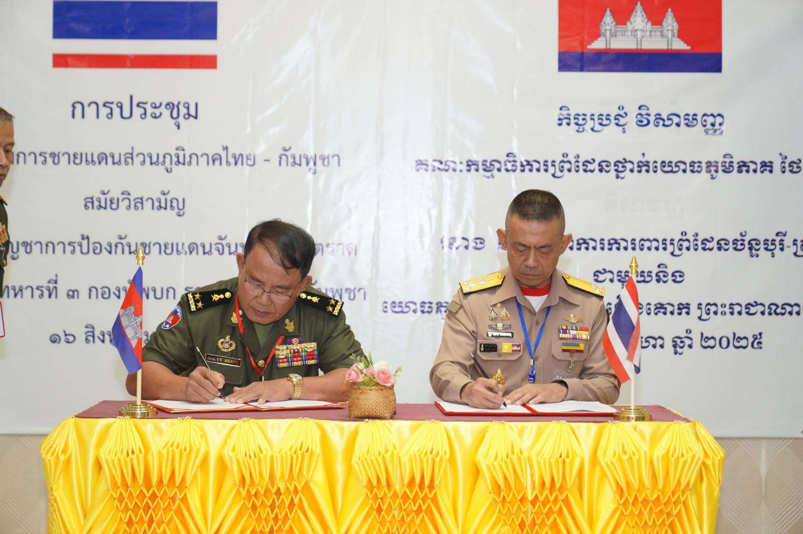 พลเรือตรี ปารัช รัตนไชยพันธ์ รองโฆษกกองทัพเรือ เปิดเผยว่า วันนี้ ( 16 สิงหาคม 2568) พลเรือโท อภิชาติ ทรัพย์ประเสริฐ ผู้บัญชาการป้องกันชายแดนจันทบุรีและตราด และ พลตรี อุย เฮียง ผู้บัญชาการภูมิภาคทหารที่ 3 ของ กองทัพบก กัมพูชา ตลอดจนคณะกรรมการชายแดนส่วนภูมิภาค ของทั้งสองฝ่ายได้จัดให้มีการประชุมคณะกรรมการชายแดนส่วนภูมิภาค ไทย -กัมพูชา สมัยวิสามัญ (Regional Border Committee ) หรือ RBC ณ ประเทศไทย ที่บ้านทะเลภูรีสอร์ท อำเภอคลองใหญ่ จังหวัดตราด เพื่อร่วมกันหารือ ในการแก้ไขปัญหาต่างๆ เพื่อความสงบเรียบร้อยในพื้นที่และการดำเนินชีวิตของประชาชนทั้งสองประเทศด้วยสันติวิธี และได้ลงนามใน ”บันทึกความตกลงการประชุมคณะกรรมการชายแดนส่วนภูมิภาครับ(RBC) สมัยวิสามัญระหว่าง กองบัญชาการป้องกันชายแดนจันทบุรีและตราด ราชอาณาจักรไทย กับภูมิภาคที่ 3 ราชอาณาจักรกัมพูชา วันที่ 16 สิงหาคม 2568 ณ จังหวัดตราด ประเทศไทย“