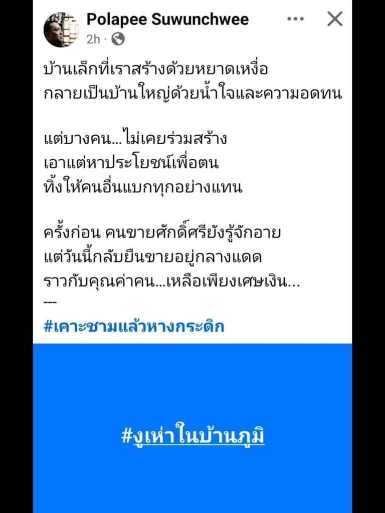 วันที่ 16 สิงหาคม 2568 นายพลพีร์ สุวรรณฉวี สส.นครราชสีมา พรรคภูมิใจไทย โพสต์เฟซบุ๊ก หลังการพิจารณาร่าง พ.ร.บ.งบประมาณรายจ่ายประจำปีงบประมาณ พ.ศ. 2569 เสร็จสิ้น ว่า บ้านเล็กที่เราสร้างด้วยหยาดเหงื่อกลายเป็นบ้านใหญ่ด้วยน้ำใจและความอดทน แต่บางคน…ไม่เคยร่วมสร้างเอาแต่หาประโยชน์เพื่อตน ทิ้งให้คนอื่นแบกทุกอย่างแทน ครั้งก่อน คนขายศักดิ์ศรียังรู้จักอาย แต่วันนี้กลับยืนขายอยู่กลางแดดราวกับคุณค่าคน…เหลือเพียงเศษเงิน…