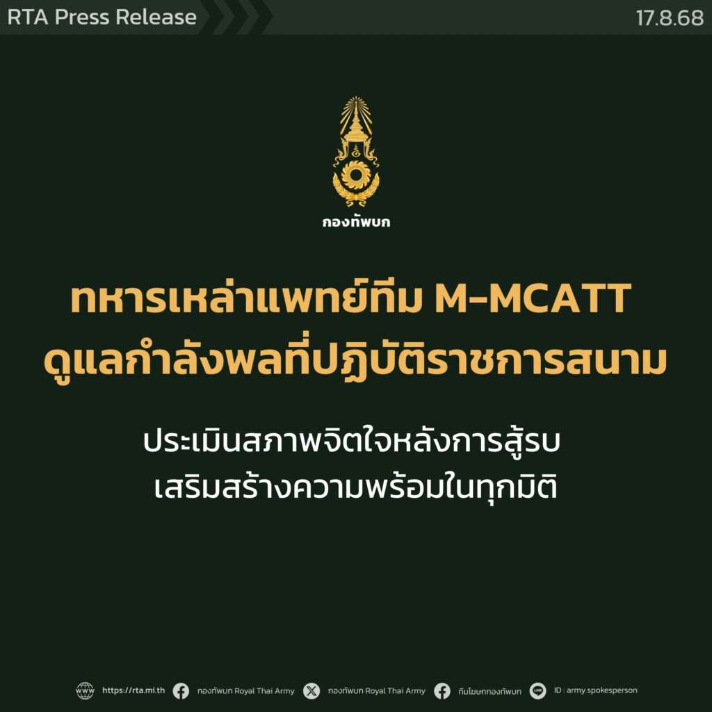 ทั้งนี้ กองทัพบกให้ความสำคัญกับการดูแลสภาพจิตใจของกำลังพลทุกระดับ ซึ่งถือเป็นปัจจัยสำคัญต่อความสำเร็จของภารกิจ โดยทีม M-MCATT จะลงพื้นที่อย่างต่อเนื่อง เพื่อดูแลกำลังพลผู้เสียสละในการปกป้องอธิปไตยของชาติ ด้วยความเข้มแข็งรอบด้านอย่างเต็มที่และดีที่สุด