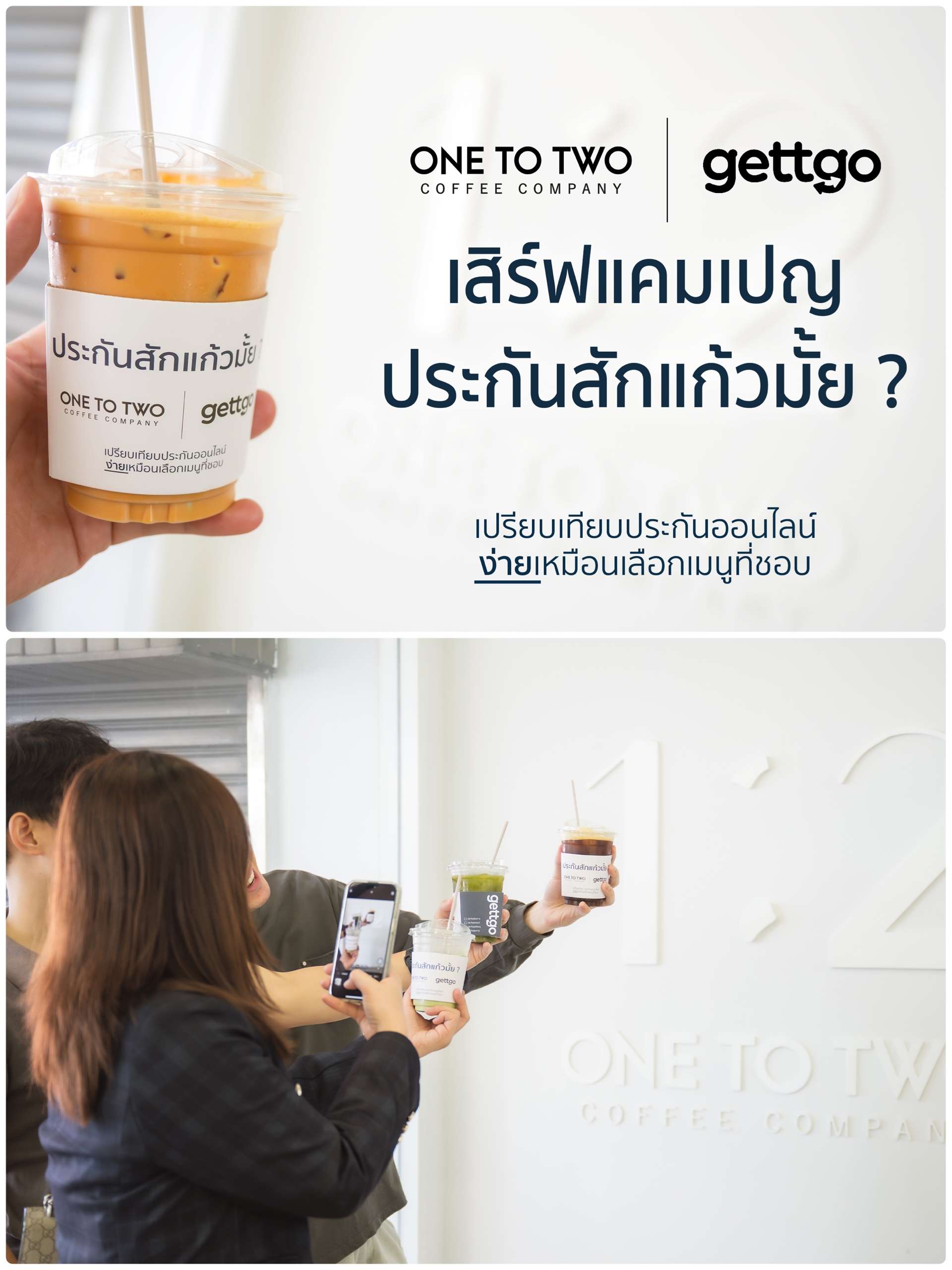 บริษัท เมืองไทย โบรกเกอร์ จำกัด ผู้ให้บริการ gettgo แพลตฟอร์มเปรียบเทียบประกันออนไลน์ ร่วมกับ 1:2 Coffee Company ร้านกาแฟขวัญใจชาวออฟฟิศ ที่เริ่มต้นจากจังหวัดเชียงรายและเติบโตสู่เมืองกรุง พร้อมชวนคนทุก Generation มาดื่มกาแฟชิล ๆ รับสิทธิ์ส่วนลดผ่านแคมเปญ “ประกันสักแก้วมั้ย?” และทำความรู้จักกับประกันในบรรยากาศสบาย ๆ ผ่านประสบการณ์การดื่มกาแฟที่ร้าน 1:2 Coffee
