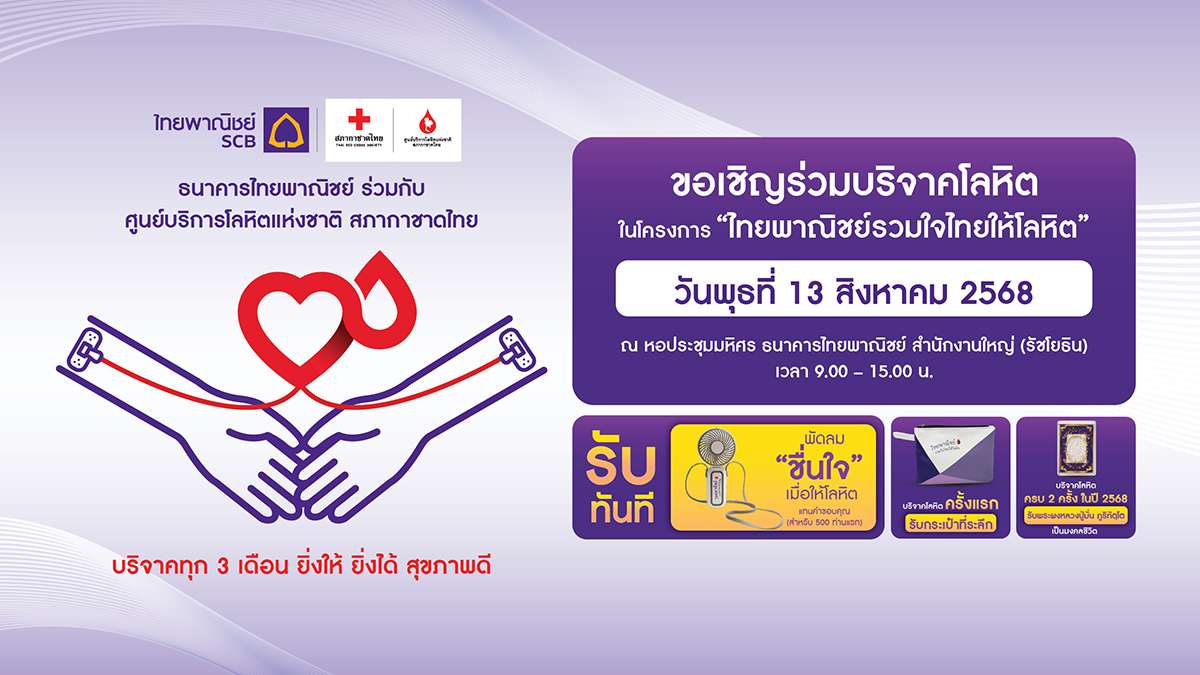 กลุ่มเอสซีบีเอกซ์ โดยธนาคารไทยพาณิชย์ ร่วมกับ ศูนย์บริการโลหิตแห่งชาติ สภากาชาดไทยขอเชิญร่วมบริจาคโลหิต เติมเต็มปริมาณโลหิตสำรองคงคลัง ภายใต้โครงการ “ไทยพาณิชย์รวมใจไทยให้โลหิต” ในวันพุธที่ 13 สิงหาคม 2568 เวลา 9.00-15.00 น. ณ หอประชุมมหิศร ธนาคารไทยพาณิชย์ สำนักงานใหญ่ (รัชโยธิน) เพื่อส่งต่อโลหิตที่มีคุณภาพให้มีเพียงพอต่อการรักษาพยาบาลผู้ป่วยทั่วประเทศ ยังมีผู้ป่วยจำนวนมากที่กำลังรอรับโลหิตเพื่อต่อลมหายใจ ทุก ๆ การบริจาคโลหิต 1 ครั้ง สามารถนำไปช่วยชีวิตผู้ป่วยได้มากกว่า 3 ชีวิต สำหรับผู้ที่บริจาคโลหิตครั้งแรกรับทันทีกระเป๋าที่ระลึก บริจาคโลหิตครบ 2 ครั้งในปี 2568 รับพระผงหลวงปู่มั่น ภูริทตฺโต เป็นมงคลชีวิต และ 500 ท่านแรกที่ร่วมบริจาคโลหิต รับพัดลม “ชื่นใจ” แทนคำขอบคุณ