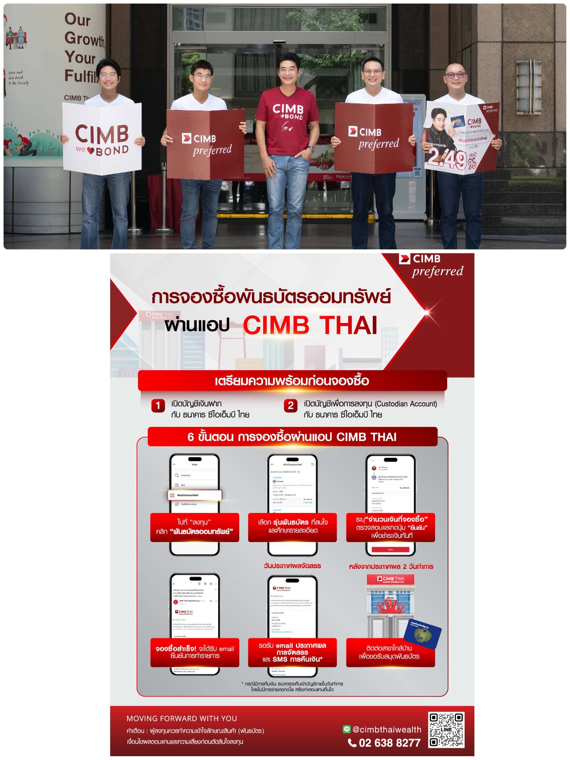 CIMB THAI และ ก้อง สหรัถ สังคปรีชา เดินสายโปรโมตพันธบัตรออมทรัพย์กระทรวงการคลัง รุ่น 10 ปี อัตราดอกเบี้ยเฉลี่ย 2.49% ต่อปี ส่งเสริมการออมให้คนไทย โดยเริ่มต้นเดินสายจากย่านเยาวราช มาต่อที่ถนนชิดลม-หลังสวน และต้อนรับทักทายมอบของที่ระลึกในแคมเปญสุดพิเศษให้ลูกค้าที่มาจองซื้อพันธบัตรที่ธนาคาร ซีไอเอ็มบี ไทย สำนักงานใหญ่ วันที่ 4 ส.ค.2568 ที่ผ่านมาโดยมี วุธว์ ธนิตติราภรณ์ กรรมการผู้จัดการใหญ่และธานเจ้าหน้าที่บริหาร พร้อมคณะผู้บริหารธนาคาร เพา จาตกานนท์ ภูดินันท์ เศรษฐนันท์ และตัน คีท จิน ร่วมต้อนรับลูกค้าที่เดินทางมาจองซื้อพันธบัตร