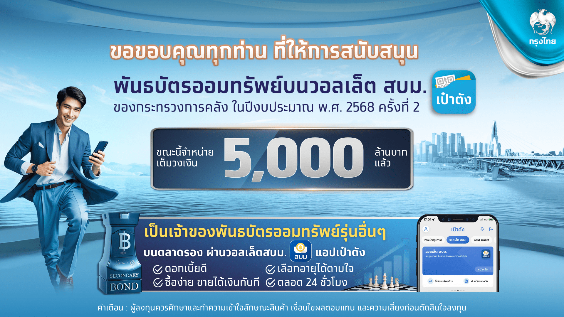 สบน.-กรุงไทย ประกาศความสำเร็จ ในการเสนอขายพันธบัตรออมทรัพย์ วอลเล็ต สบม. ของกระทรวงการคลัง ในปีงบประมาณ พ.ศ. 2568 ครั้งที่ 2 ในแอปฯ เป๋าตัง ผู้จองซื้อเต็มวงเงิน 5,000 ล้านบาท สะท้อนศักยภาพนวัตกรรมการลงทุนที่ตอบโจทย์ผู้ลงทุน ผ่านช่องทางดิจิทัลที่ทุกคนเข้าถึงได้อย่างสะดวก เท่าเทียม และโปร่งใส สนับสนุนการออมและการลงทุนเพื่อความมั่นคงทางการเงินอย่างยั่งยืน