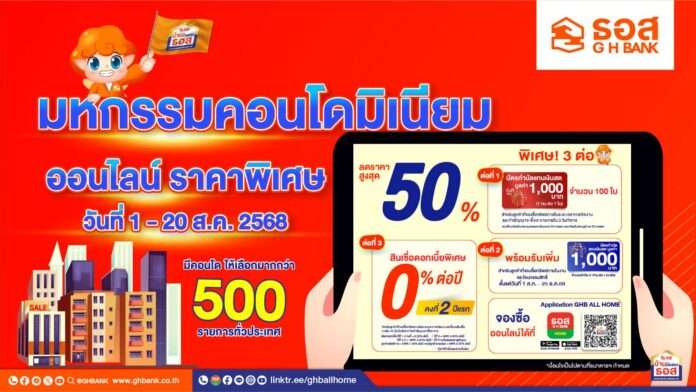ธอส. จัดงาน “มหกรรมคอนโดมิเนียมออนไลน์ ราคาพิเศษ” โดยนำคอนโดมิเนียมมือสองคุณภาพดี ออกจำหน่ายกว่า 500 รายการทั่วประเทศ ลดราคาสูงสุด 50% จากราคาปกติ ผ่าน Application : GHB ALL HOME ตั้งแต่วันนี้ถึงวันที่