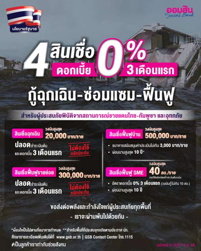 ธนาคารออมสินยังคงยึดมั่นบทบาท “ธนาคารเพื่อสังคม” ที่อยู่เคียงข้างคนไทยในทุกสถานการณ์ และพร้อมเป็นพลังทางการเงินในการฟื้นฟูชีวิตความเป็นอยู่และขับเคลื่อนเศรษฐกิจของประเทศ ที่ผ่านมาธนาคารได้ส่งความช่วยเหลืออย่างเต็มกำลัง ทั้งการจัดส่งถุงยังชีพ “ออมสินห่วงใย” ไปยังพื้นที่ประสบภัยพิบัติทั้ง 2 เหตุการณ์แล้วกว่า 2,500 ชุด เพื่อบรรเทาความเดือดร้อนเฉพาะหน้า สนับสนุนงบประมาณจัดซื้อสิ่งของจำเป็น รวมกว่า 2.5 ล้านบาท พร้อมออกมาตรการเร่งด่วน “พักชำระหนี้อัตโนมัติ 3 เดือน โดยไม่คิดดอกเบี้ย และธนาคารเป็นผู้รับภาระดอกเบี้ยแทนลูกหนี้ทั้งหมดในช่วงเวลาดังกล่าว” เพื่อลดภาระทางการเงินให้ลูกหนี้ได้ฟื้นตัว ศึกษารายละเอียดเพิ่มเติมเกี่ยวกับสินเชื่อได้ที่เว็บไซต์ www.gsb.or.th