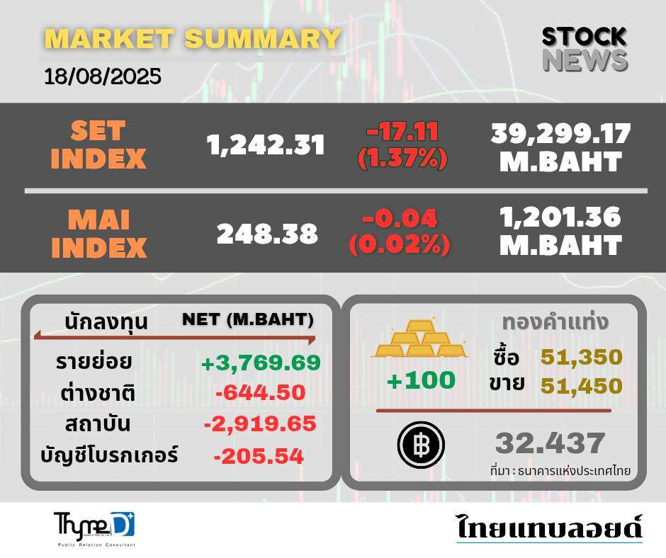 SET ปิดวันนี้ที่ 1,242.31 จุด ลดลง 17.11 จุด (-1.36%) มูลค่าซื้อขาย 39,299.17 ล้านบาท