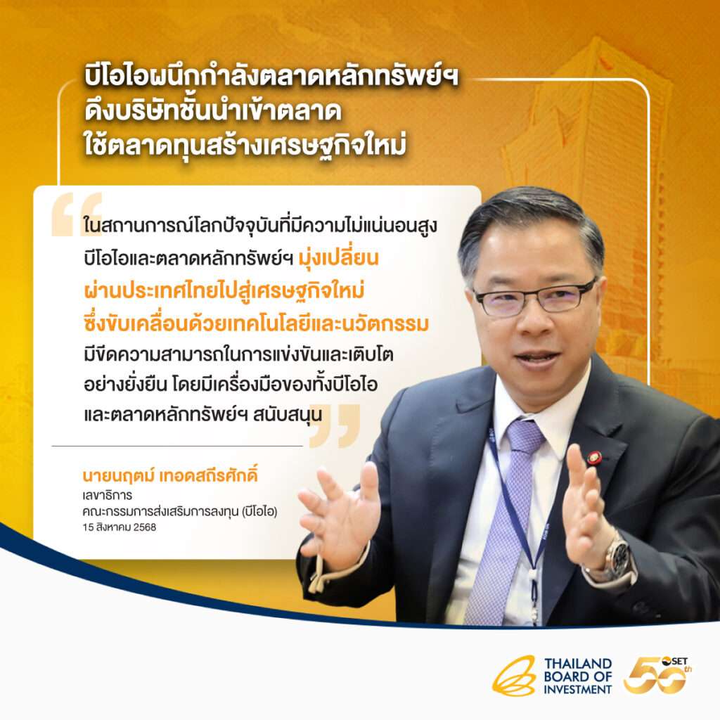 กรุงเทพฯ, วันที่ 19 ส.ค. – นายนฤตม์ เทอดสถีรศักดิ์ เลขาธิการคณะกรรมการส่งเสริมการลงทุน (บีโอไอ) เปิดเผยว่า เมื่อวันที่ 15 ที่ผ่านมา บีโอไอ ได้หารือร่วมกับ นายอัสสเดช คงสิริ กรรมการและผู้จัดการ และคณะผู้บริหารตลาดหลักทรัพย์แห่งประเทศไทย (ตลท.) เพื่อพัฒนาความร่วมมือระหว่างสองหน่วยงานในการเปลี่ยนผ่านประเทศไทยไปสู่เศรษฐกิจใหม่ ซึ่งขับเคลื่อนด้วยเทคโนโลยีและนวัตกรรม มีขีดความสามารถในการแข่งขัน และเติบโตอย่างยั่งยืน ผ่านการใช้เครื่องมือของทั้งบีโอไอและตลาดหลักทรัพย์ ในการผลักดัน 2 เรื่องสำคัญ คือ 1) การดึงบริษัทชั้นนำจากต่างประเทศที่เข้ามาตั้งฐานธุรกิจในประเทศไทยและได้รับการส่งเสริมการลงทุนจากบีโอไอในอุตสาหกรรมเทคโนโลยีขั้นสูง ให้เข้ามาจดทะเบียนในตลาดหลักทรัพย์ และ 2) การสนับสนุนให้บริษัทที่จดทะเบียนในตลาดหลักทรัพย์อยู่แล้ว มีการลงทุนเพื่อเพิ่มมูลค่า ยกระดับประสิทธิภาพการผลิต และสร้างการเติบโตอย่างยั่งยืนผ่านการให้สิทธิประโยชน์จากทั้งสองหน่วยงาน