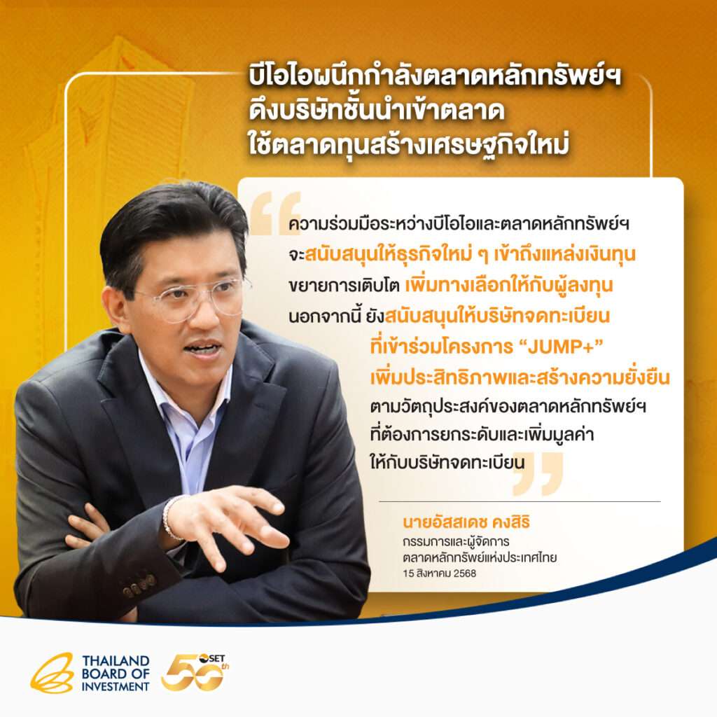 บีโอไอ และ ตลาดหลักทรัพย์ ผนึกกำลังขับเคลื่อนประเทศไทยไปสู่เศรษฐกิจใหม่ นำร่องดึงต่างชาติที่ได้รับส่งเสริมการลงทุนในอุตสาหกรรมเทคโนโลยีขั้นสูง 3 สาขาหลัก คือ อิเล็กทรอนิกส์และเครื่องใช้ไฟฟ้าอัจฉริยะ ยานยนต์ไฟฟ้า และดิจิทัล เข้าจดทะเบียน พร้อมส่งเสริมบริษัทในตลาดฯ สร้างมูลค่าและความยั่งยืน ด้วยสิทธิประโยชน์บีโอไอและการสนับสนุนจาก ตลท.