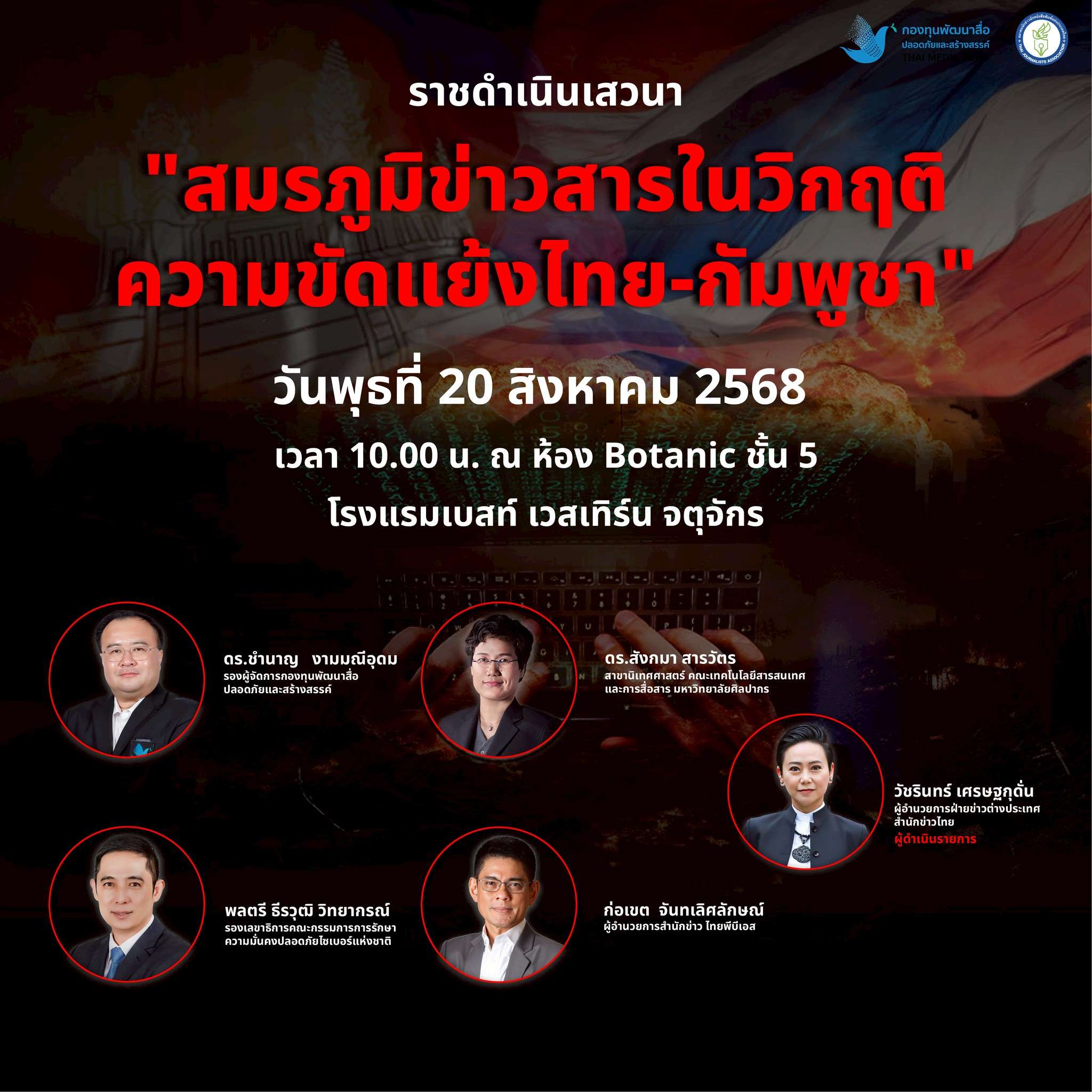 สมาคมนักข่าวนักหนังสือพิมพ์แห่งประเทศไทย ร่วมกับกองทุนพัฒนาสื่อปลอดภัยและสร้างสรรค์ ขอเชิญสื่อมวลชนทุกแขนงร่วมกิจกรรมราชดำเนินเสวนา หัวข้อ “สมรภูมิข่าวสารในวิกฤติความขัดแย้งไทย-กัมพูชา” เพื่อสร้างความรู้ความเข้าใจเกี่ยวกับสถานการณ์ข่าวสารในวิกฤติความขัดแย้งไทย-กัมพูชา พบกับวิทยากรผู้ทรงคุณวุฒิหลากหลายท่าน ได้แก่