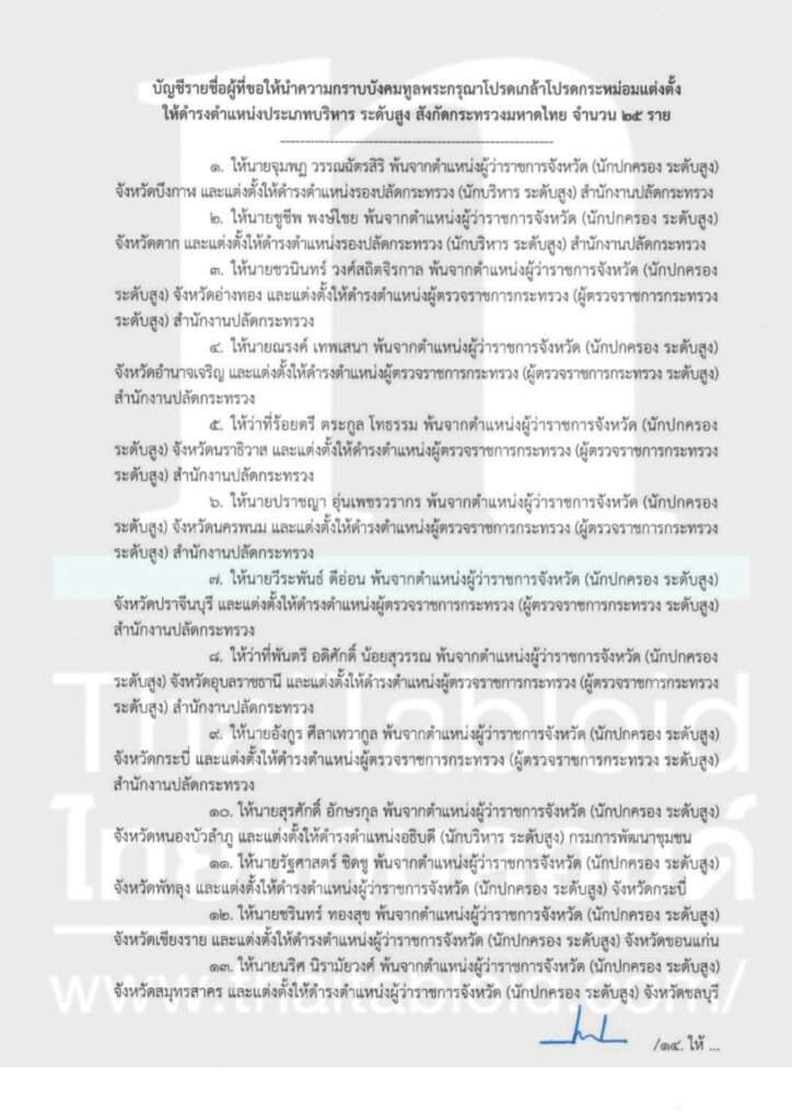 (15)ให้นายทศพล เผื่อนอุดม พันจากตำแหน่งผู้ตรรรรรารกระทระทรวง [ผู้ตรวจราชการกระทรวง ระดับสูง) สำนักงานปลัดกระทรวง และแต่งตั้งให้ดำรงตำแหน่งผู้ว่าราชการจังหวัด (นักปกปกครองระดับสูง) จังหวัดเชียงใหม่