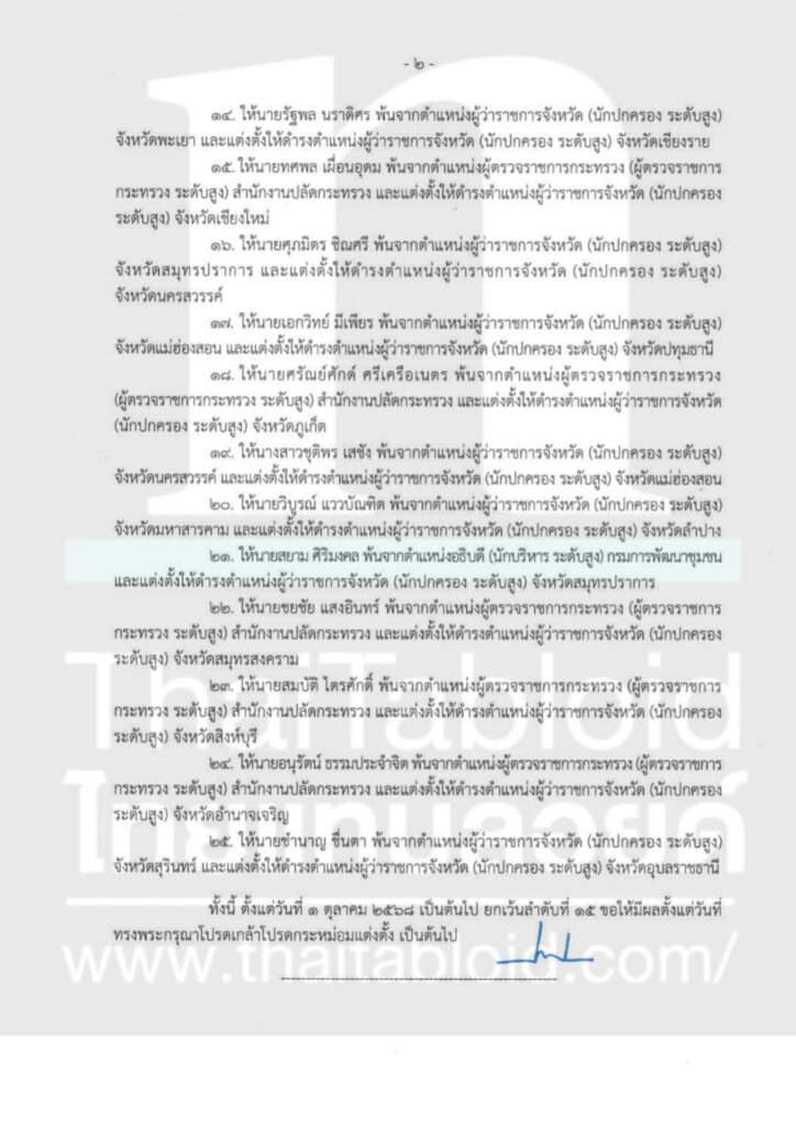ทั้งนี้ ตั้งแต่วันที่ 1 ตุลาคม 2568 เป็นต้นไป ยกเว้นลำดับที่ 15 ขอให้มีผลทั้งแต่วันที่ทรงพระกรุณาโปรดเกล้าโปรดกระหม่อมแต่งตั้ง เป็นต้นไป