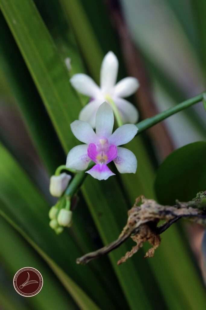 กล้วยไม้ชนิดนี้ถูกค้นพบในพื้นที่อุทยานแห่งชาติใต้ร่มเย็น ที่ระดับความสูง 0-600 เมตรจากระดับน้ำทะเล เป็นกล้วยไม้อิงอาศัยขนาดเล็กที่มีรากใหญ่และแบน เกาะติดกับเปลือกไม้ ใบมีเพียง 2-3 ใบ เป็นรูปรีหรือขอบขนาน มีสีเขียวเข้มและเป็นมัน ส่วนช่อดอกจะมีสีเขียว ออกจากข้างลำต้นและห้อยลงหรืออยู่ในแนวระนาบ ดอกจะทยอยบานจากโคนสู่ปลายช่อ โดยดอกกว้างประมาณ 1.4 เซนติเมตร กลีบดอกมีสีขาวและมีจุดสีม่วงที่โคน นอกจากนี้ กลีบปาก มีลักษณะคล้ายรูปสี่เหลี่ยมข้าวหลามตัด ปลายสุดมีสีขาว และมีกลุ่มเนื้อเยื่อคล้ายเขี้ยวยื่นออกมาสองอัน