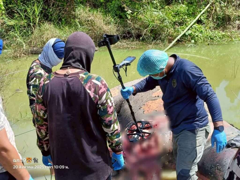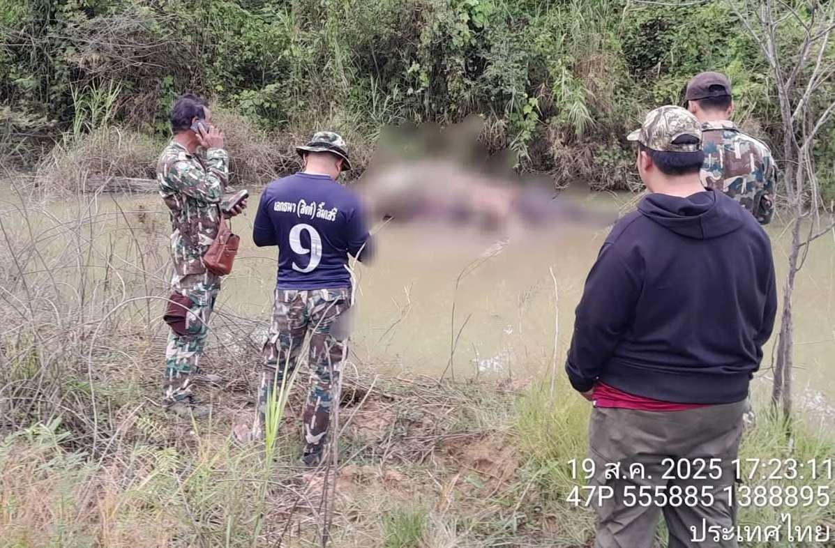 เจ้าหน้าที่ได้ทำการตรวจสอบภายนอกไม่พบรอยบาดแผลจากกระสุน พบเพียงรอยขูดขีดตามผิวหนัง และรอยช้ำขนาดใหญ่บริเวณท้องด้านซ้าย จึงคาดว่ารอยดังกล่าว “เกิดจากการทำร้ายของช้างใหญ่” จึงทำให้ช้างตัวนี้ได้รับบาดเจ็บและลงมานอนแช่น้ำ จนตายลงในที่สุด เนื่องจากสภาพซากเน่าเปื่อย เจ้าหน้าที่ไม่สามารถเก็บตัวอย่างอวัยวะภายในเพื่อตรวจหาสาเหตุการตายที่แน่ชัดได้ จึงดำเนินการขออนุญาตจากเจ้าหน้าที่ตำรวจ สภ.บ้านหนอง เพื่อฝังกลบซากทันที โดยใช้รถแบคโฮขุดหลุม โรยปูนขาวรอบบริเวณ และจัดทำบันทึกส่งรายงานตามขั้นตอน เพื่อป้องกันการแพร่กระจายของเชื้อโรคในพื้นที่