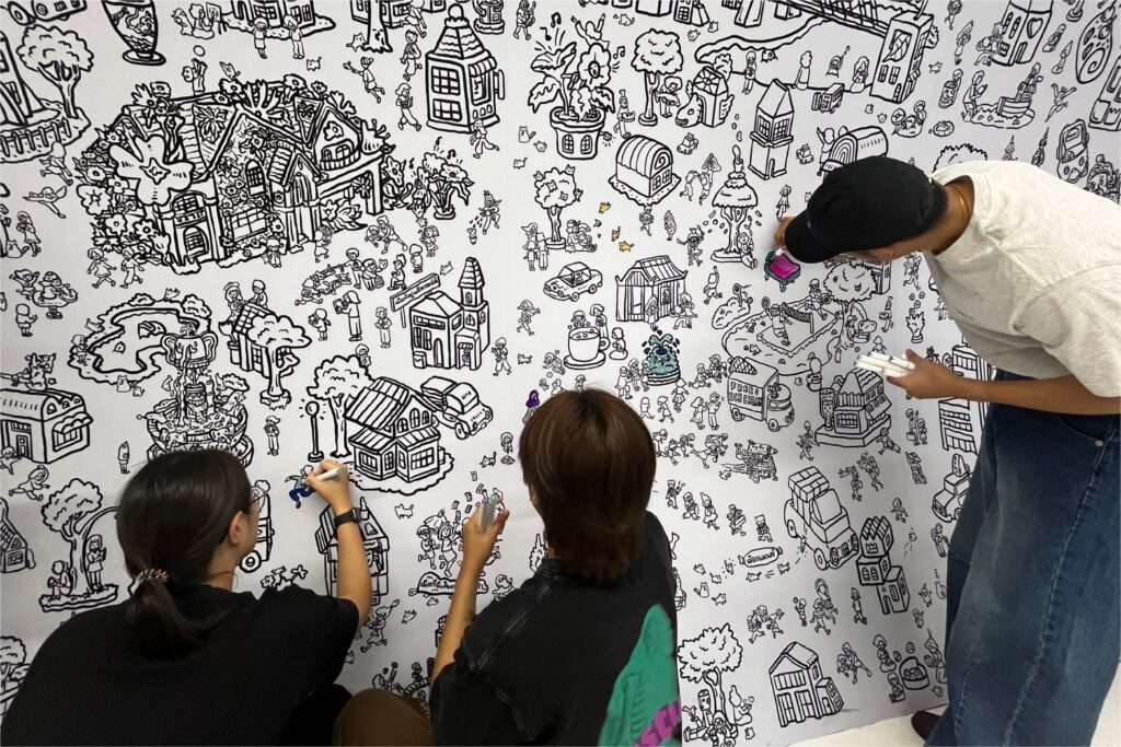 สำหรับงาน “MasterPeace Pain-ting ที่ระบาย…ให้ใจสบาย” จัดโดย Frasers Property Thailand ณ อุโมงค์เชื่อมมิตร สามย่านมิตรทาวน์ รังสรรค์ภาพวาดลายเส้นสีดำบนพื้นขาว ยาวกว่า 43 เมตร บนผนังอุโมงค์ ให้ทุกคนได้มาร่วมสร้างสรรค์ “ที่ที่ชีวิตดี” ผ่านการ “ระบาย(สี)” เพื่อ “เติมสีสัน” ภาพวาดเมืองในฝัน ให้ใจฟูไปด้วยกัน พร้อม “ตามหา” ความสุขเล็ก ๆ ของคนเมืองที่ซ่อนในภาพวาด ได้ตั้งแต่วันนี้ – 20 ก.ย. 68