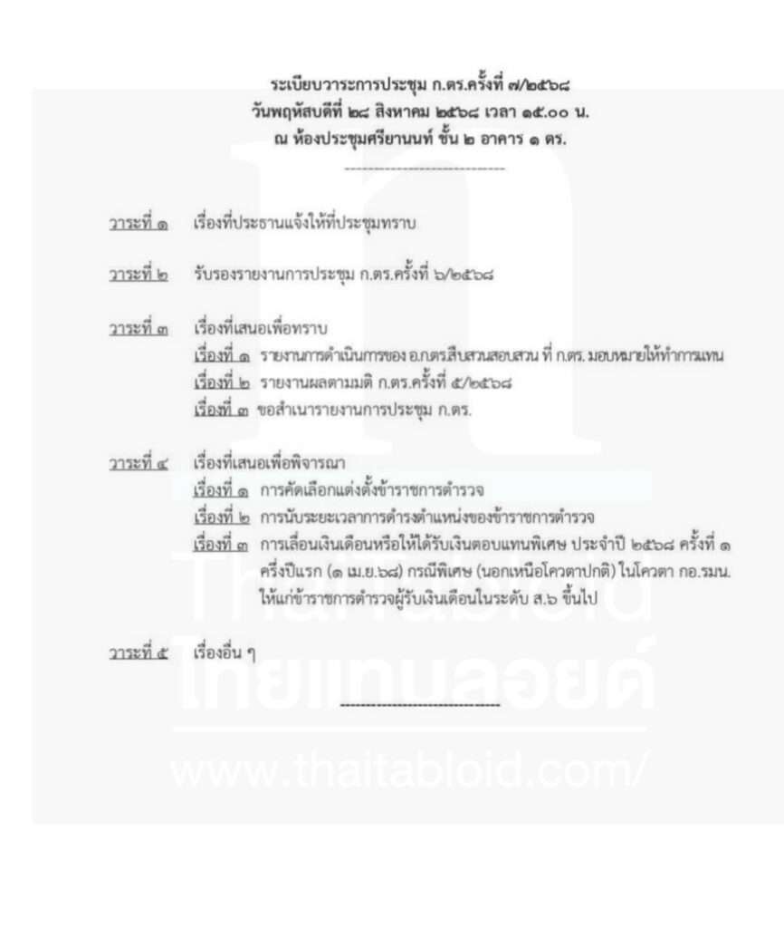 ระเบียบวาระการประชุม ก.ตร. ครั้งที่ 7/2568 ในวันพฤหัสบดีที่ 28 สิงหาคม 2568 เวลา 15.00 น. ณ ห้องประชุมศรียานนท์ ชั้น 2 อาคาร 1 ตร.