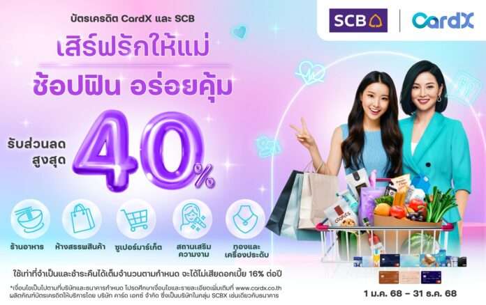 CardX ส่งแคมเปญพิเศษต้อนรับเดือนสิงหาคม ด้วยแคมเปญ “เสิร์ฟรักให้แม่ ช้อปฟิน อร่อยคุ้ม” มอบสิทธิพิเศษสุดคุ้มตอบโจทย์ทุกไลฟ์สไตล์ของลูกค้าบัตรเครดิต CardX และ SCB ที่ต้องการมอบความสุขให้คุณแม่ในเดือนแห่งความรักนี้ ผ่านหมวดหมู่ยอดนิยมที่ลูกค้าเลือกใช้จ่ายมากที่สุดในช่วงวันแม่ของทุกปี