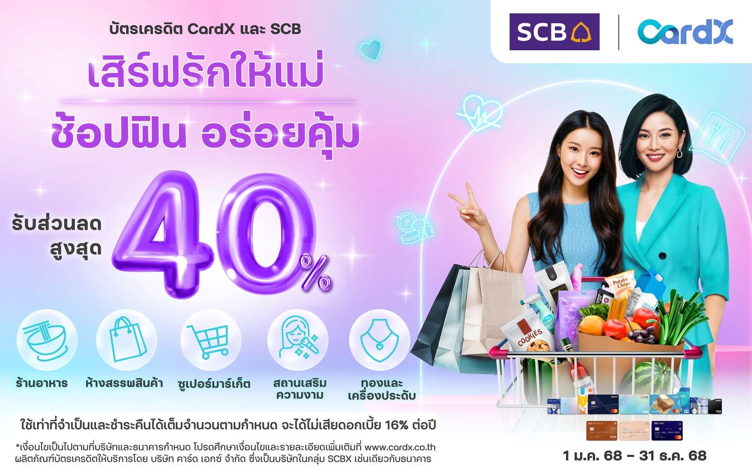 CardX จัดแคมเปญสำหรับบัตรเครดิต CardX และ SCB โดยอ้างอิงจากข้อมูล Insight ซึ่ง นางสาวกัญฒ์ภิอร สุวรรณ รองประธานเจ้าหน้าที่บริหารงานธุรกิจคู่ค้าสัมพันธ์ บริษัท คาร์ด เอกซ์ จำกัด เปิดเผยว่า จากพฤติกรรมของลูกค้าบัตรในช่วงเดือนสิงหาคมปีที่ผ่านมา พบว่า 5 หมวดหมู่ที่มีการใช้จ่ายผ่านบัตรเครดิตสูงสุด ได้แก่ ซูเปอร์มาร์เก็ตและไฮเปอร์มาร์เก็ต, ร้านอาหาร, ห้างสรรพสินค้า, สถานเสริมความงาม และทองกับเครื่องประดับ ซึ่งล้วนสะท้อนถึงไลฟ์สไตล์ของลูกค้าที่ต้องการมอบสิ่งดี ๆ ให้คุณแม่ในช่วงเวลาสำคัญของปี เพื่อให้ลูกค้าได้ใช้จ่ายอย่างคุ้มค่าและตรงใจ CardX จึงจัดโปรโมชันพิเศษครอบคลุมหมวดใช้จ่ายยอดนิยม มอบสิทธิประโยชน์รับส่วนลดสูงสุด 40%* ตลอดแคมเปญ