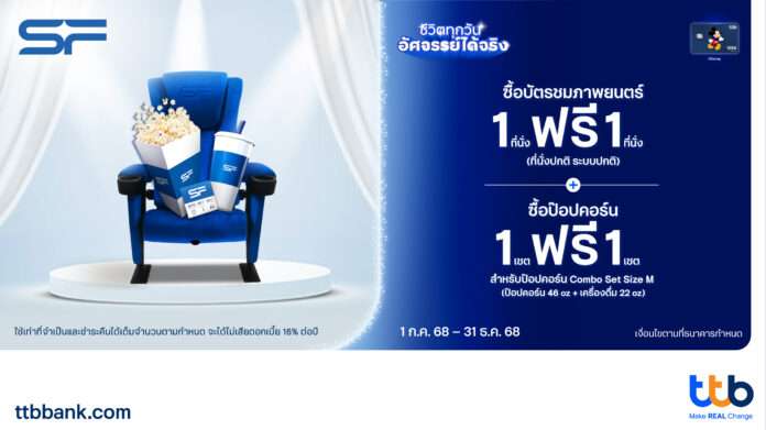 ทีเอ็มบีธนชาต หรือ ทีทีบี ร่วมกับ SF Cinema เชิญชวนคนรักการชมภาพยนตร์มาร่วมสัมผัสประสบการณ์ความคุ้มแบบคูณสอง โดยมอบสิทธิพิเศษเฉพาะผู้ถือบัตรเครดิต ttb Disney คุ้มที่ 1 เพียงซื้อบัตรชมภาพยนตร์จำนวน 1 ที่นั่ง รับฟรี 1 ที่นั่ง (ที่นั่งปกติ ระบบปกติ) ผ่านช่องทางเครื่องจำหน่ายตั๋วอัตโนมัติ Express Ticket, SF Application และ SF Website โดยลูกค้าต้องกดรับสิทธิ์ด้วยตนเองผ่านแอป ttb touch ก่อนชำระเงินผ่านบัตรเครดิต ttbDisney และคุ้มที่ 2 พิเศษมากกว่ารับสิทธิ์อิ่มอร่อยสุดฟิน เมื่อซื้อป๊อปคอร์นCombo Set Size M (ป๊อปคอร์น 46 oz และเครื่องดื่ม 22 oz) จำนวน 1 เซต รับฟรีทันที 1 เซต ตั้งแต่วันที่ 1 กรกฎาคม 2568 – 31 ธันวาคม 2568 ณ โรงภาพยนตร์ในเครือ SF ทุกสาขาทั่วประเทศ ยกเว้น SF Emprivé Cineclubศึกษารายละเอียดเพิ่มเติมของโปรโมชัน ได้ที่ https://www.ttbbank.com/th/promotion/credit-card/others/ttb-disney-sfcinema-jul25