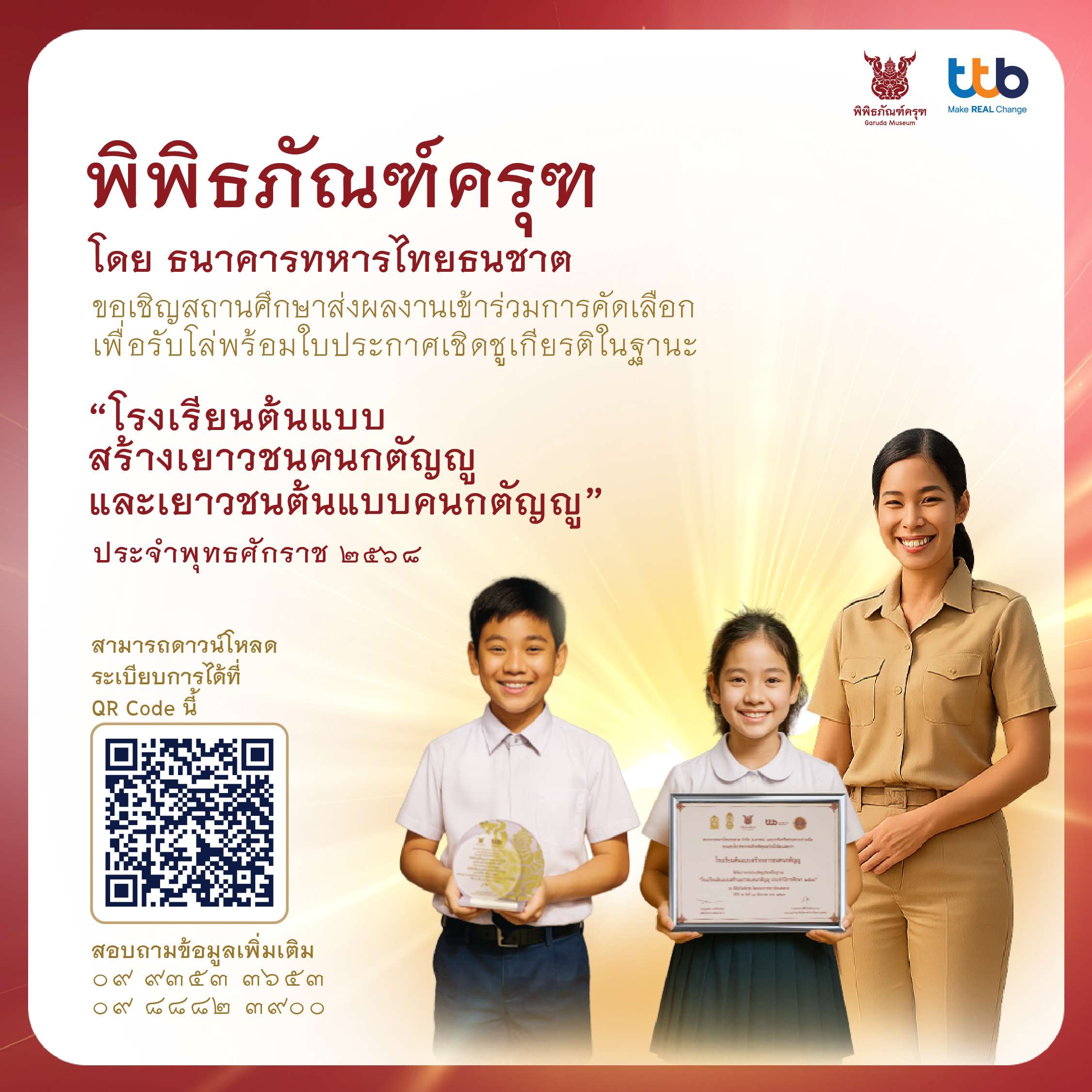 เปิดรับสถานศึกษาและเยาวชนจากทั่วประเทศ โดยสามารถส่งประวัติสถานศึกษา ข้อมูลเยาวชนต้นแบบและกิจกรรมที่เกี่ยวเนื่อง เพื่อประกอบการพิจารณามาที่ garudamuseum.ttb@gmail.com ตั้งแต่วันนี้ ถึงวันที่ 13 ตุลาคม 2568 และจะประกาศผลการพิจารณาในวันที่ 3 พฤศจิกายน 2568 สอบถามข้อมูลเพิ่มเติมได้ที่ 09 8882 3900