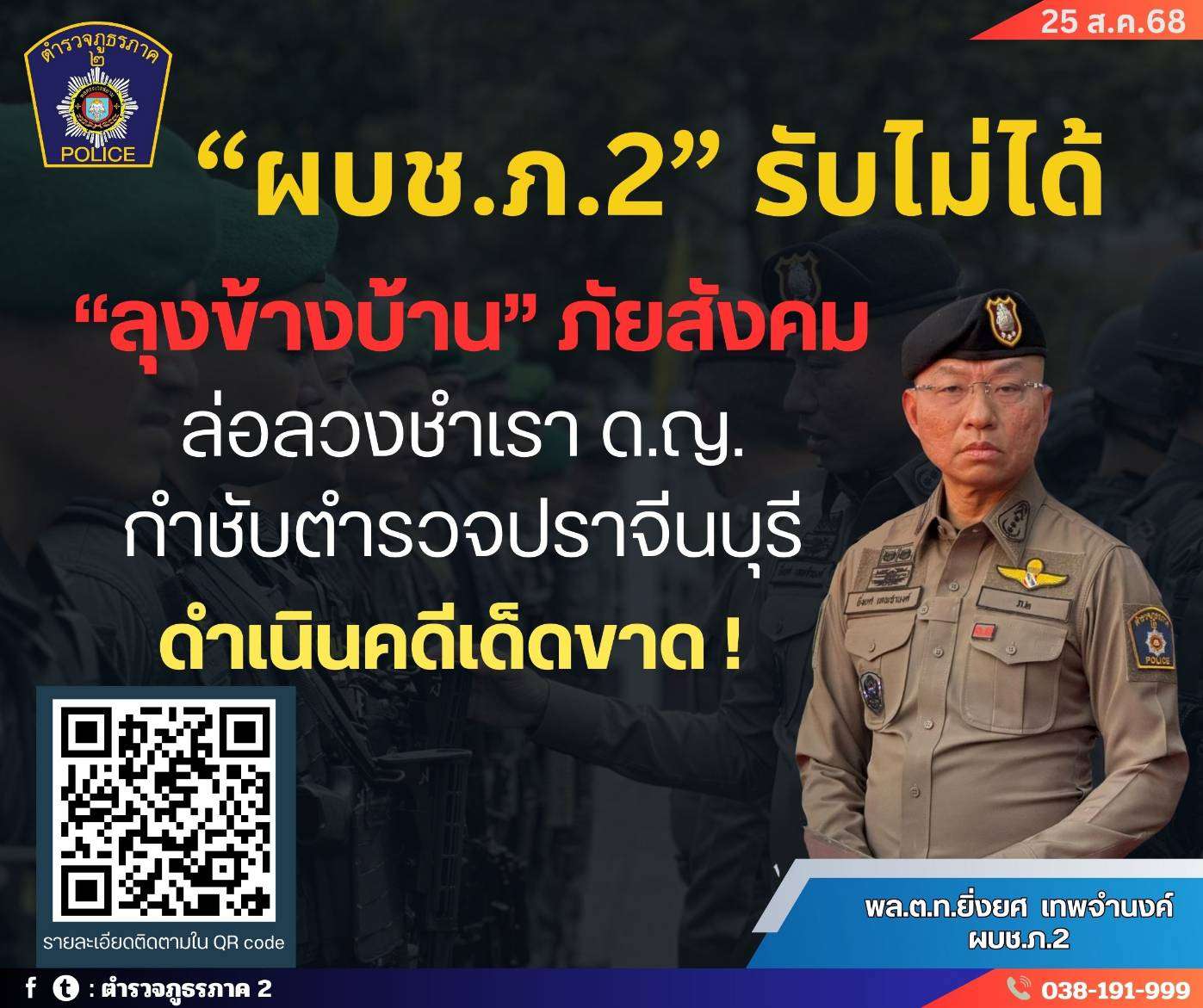 เมื่อวันที่ 25 สิงหาคม 2568 พล.ต.ท.ยิ่งยศ เทพจำนงค์ ผู้บัญชาการตำรวจภูธรภาค 2 (ผบช.ภ.2) กล่าวว่าได้รับรายงานว่า ตำรวจกองกำกับการสวัสดิภาพเด็กและสตรี กองบัญชาการตำรวจนครบาล จับกุม “ลุงข้างบ้าน” ผู้ต้องหาตามหมายจับศาลจังหวัดปราจีนบุรี ก่อเหตุกระทำชำเราเด็ก โดยหลบหนีคดีนาน 8 ปี หลังก่อเหตุล่อลวงเด็กหญิงชั้นประถมศึกษาจากโรงเรียน ออกอุบายกระทำชำเรา เหตุเกิดในพื้นที่ จว.ปราจีนบุรี ตั้งแต่ปี 2560 หลบหนีไปจนถูกจับได้ที่ จว.นนทบุรี และส่งตัวมาสอบสวนที่ สภ. เมืองปราจีนบุรี ตนจึงได้กำชับให้ดำเนินคดีอย่างเด็ดขาด และให้คัดค้านการประกันตัว