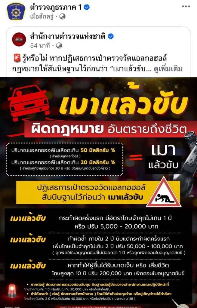 รู้หรือไม่? ปฏิเสธเป่าเครื่องวัดแอลกอฮอล์ = ถือว่าเมาแล้วขับ ปริมาณแอลกอฮอล์เกิน 50 มก.% (บุคคลทั่วไป) เกิน 20 มก.% (ผู้มีอายุต่ำกว่า 20 ปี หรือใช้ใบขับขี่ชั่วคราว) บทลงโทษตามกฎหมาย ครั้งแรก: จำคุกไม่เกิน 1 ปี หรือปรับ 5,000-20,000 บาท, ทำผิดซ้ำใน 2 ปี: จำคุกไม่เกิน 2 ปี ปรับ 50,000-100,000 บาท พร้อมพักใช้หรือเพิกถอนใบอนุญาตขับขี่และหากทำให้ผู้อื่นบาดเจ็บหรือเสียชีวิต: จำคุกสูงสุด 10 ปี ปรับสูงสุด 200,000 บาท พร้อมเพิกถอนใบอนุญาตขับขี่