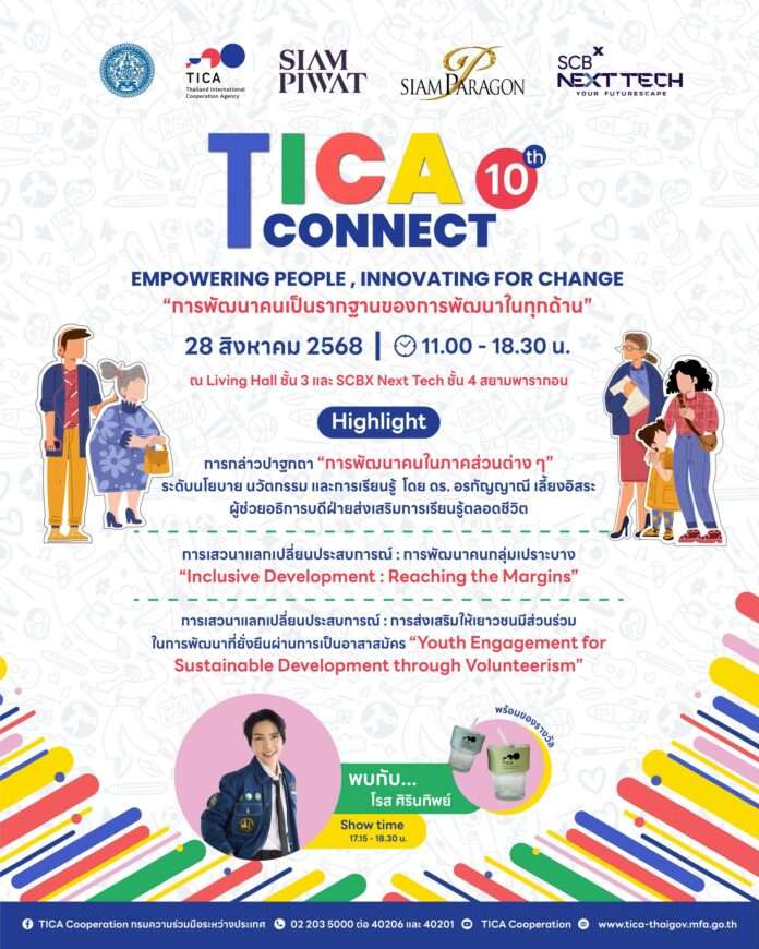 วันที่ 28 สิงหาคม 2568 ณ Living Hall ชั้น 3 และ SCBX Next Tech ชั้น 4 สยามพารากอน กรมความร่วมมือระหว่างประเทศ หรือ TICA กระทรวงการต่างประเทศ เตรียมจัดงาน TICA Connect ครั้งที่ 10 ภายใต้แนวคิด “Empowering People, Innovating for Change” คือการพัฒนาที่เน้น “คน” เป็นรากฐานของการพัฒนาในทุกด้าน รวมถึงการพัฒนาคนกลุ่มต่าง ๆ และทุกช่วงวัย เพื่อให้มีทักษะ ความรอบรู้ รวมทั้งความคิดสร้างสรรค์ สามารถปรับตัวให้เท่าทันต่อการเปลี่ยนแปลงอย่างรวดเร็วของโลก การพัฒนาที่ขับเคลื่อนด้วยนวัตกรรมในทุกรูปแบบไม่ว่าจะเป็นความก้าวหน้าทางเทคโนโลยีและนโยบายที่สร้างสรรค์นำไปสู่การพัฒนาคน เสริมสร้างความเข้มแข็งให้ชุมชน สร้างสังคมที่มีความยืดหยุ่น และเปิดโอกาสให้กับทุกคน