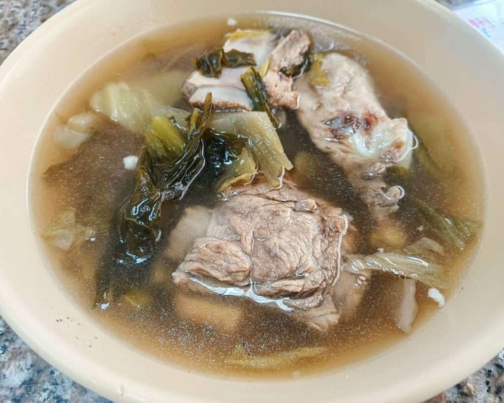 เมนูที่ 2 เป็นเมนูจานเด็ดของร้าน “ซี่โครงหมูต้มผักกาดดอง” หรือ”ตือฮวนซี่โครง” ซี่โครงหมูชิ้นโต ต้มมาจนเปื่อย กัดจนเหงือก จมฟัน รองชามด้วยผักกาดดองตุ๋น รสชาติเปรี้ยวบางๆ น้ำซุปเชงๆ เหมาะสำหรับสายดื่ม ที่ดื่มหนัก แก้แฮงค์ แก้อาการได้ดีนัก อร่อยเหมือนเดิม ขอบอก