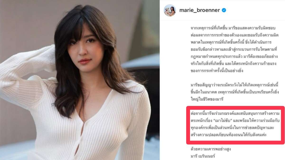 มารี เบิรนเนอร์ ดาราสาวชื่อดังโพสต์ IGส่วนตัว(marie_broenner) ระบุว่าจากเหตุการณ์ที่เกิดขึ้น มารีขอแสดงความรับผิดชอบต่อผลจากการกระทำของตัวเองและยอมรับถึงความผิดพลาดในเหตุการณ์ที่เกิดขึ้นครั้งนี้ ซึ่งได้ดำเนินการยอมรับข้อกล่าวหาและเข้าสู่กระบวนการรับโทษตามที่กฎหมายกำหนดทุกประการแล้ว มารีต้องขออภัยอย่างจริงใจกับสิ่งที่เกิดขึ้น และได้ตระหนักถึงความร้ายแรงของการกระทำครั้งนี้เป็นอย่างยิ่ง