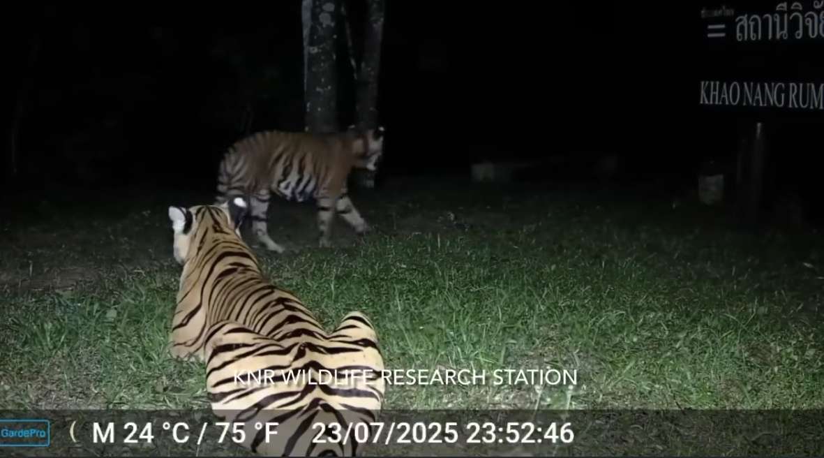 สถานีวิจัยสัตว์ป่าเขานางรำ ได้สร้างความฮือฮาให้กับวงการอนุรักษ์ ด้วยการเปิดเผยภาพสุดพิเศษของเสือโคร่งสองตัวผ่านกล้องดักถ่ายสัตว์ป่าที่ติดตั้งอยู่บริเวณหน้าป้ายของสถานีฯ