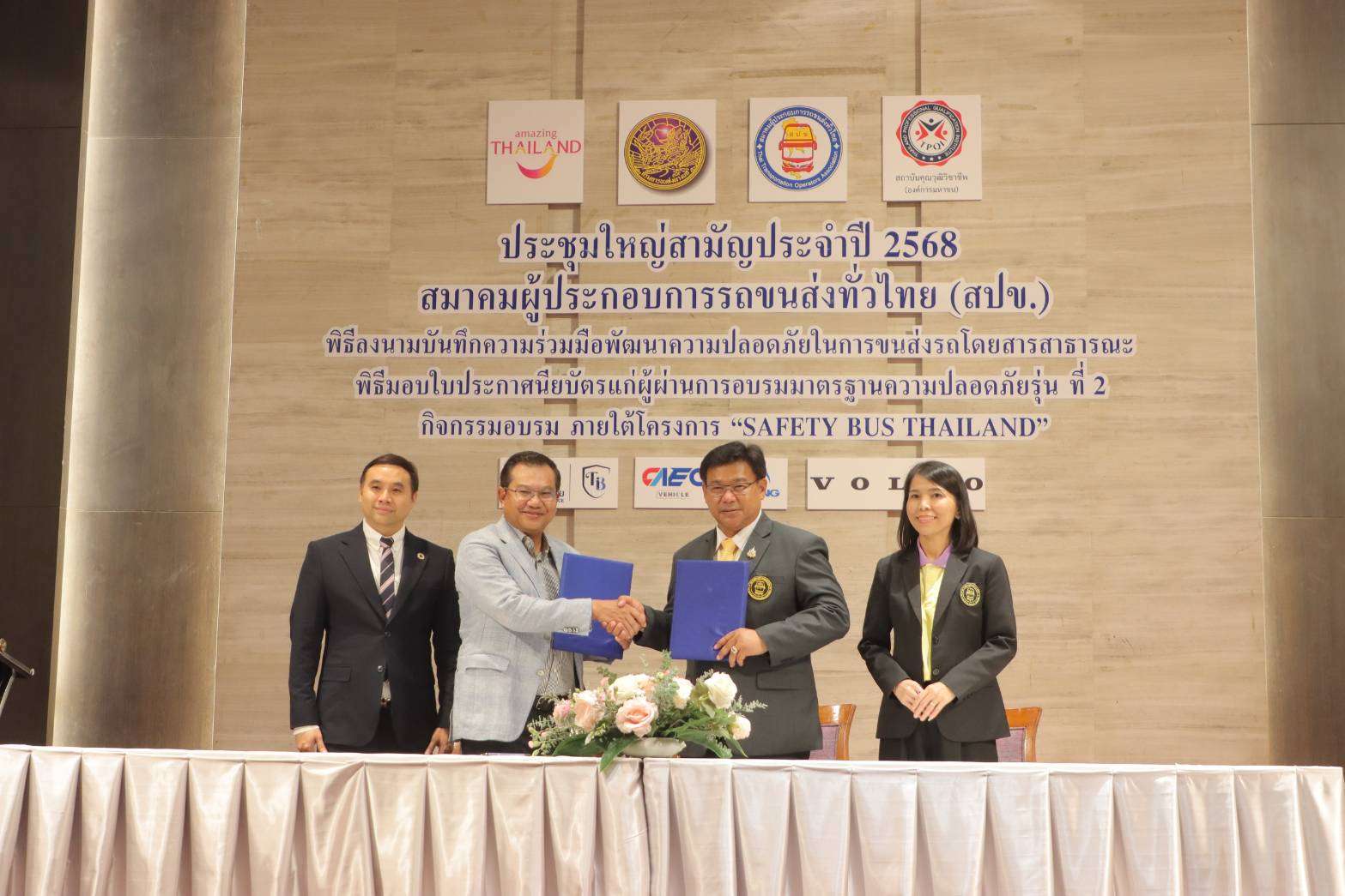 เมื่อวันที่ 27 สิงหาคม 2568 กรมการขนส่งทางบก (ขบ.) และสมาคมผู้ประกอบการรถขนส่งทั่วไทย (สปข.) ได้ร่วมกันจัดพิธีลงนามบันทึกข้อตกลงความร่วมมือ (MOU) ด้านความปลอดภัยของรถยนต์โดยสารสาธารณะ ณ โรงแรมรามาการ์เด้นส์ เขตบางเขน กรุงเทพมหานครพิธีลงนามครั้งนี้ มี นายจิรุตม์ วิศาลวิจิตร อธิบดีกรมการขนส่งทางบก เป็นผู้แทนฝ่ายราชการ และ ดร.วสุเชษฐ์ โสภณเสถียร นายกสมาคมผู้ประกอบการรถขนส่งทั่วไทย เป็นผู้แทนภาคเอกชน โดยมีคณะผู้บริหาร เจ้าหน้าที่ และผู้ประกอบการ ร่วมเป็นสักขีพยานอย่างพร้อมเพรียง