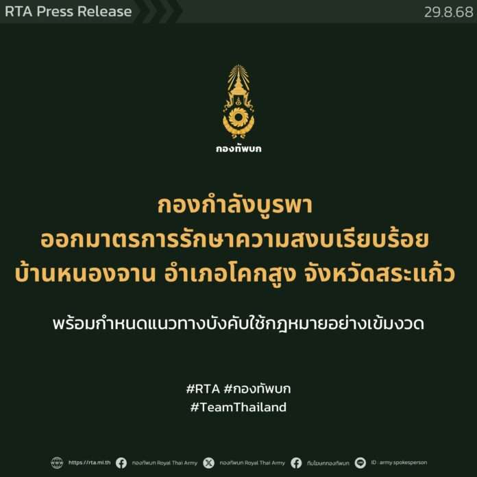 กองทัพบก, 29 สิงหาคม 2568 ทีมโฆษกกองทัพบก เปิดเผยว่า ภายหลังปรากฏเหตุประชาชนจากฝั่งกัมพูชาลักลอบเข้ามาก่อความไม่สงบในเขตแดนไทย อันเป็นภัยต่อความมั่นคงและความปลอดภัยของประชาชนในพื้นที่บ้านหนองจาน ตำบลโนนหมากมุ่น อำเภอโคกสูง จังหวัดสระแก้ว เพื่อเป็นการคุ้มครองชีวิตและทรัพย์สินของพี่น้องประชาชนไทย และรักษาอธิปไตยของชาติ กองกำลังบูรพา จึงอาศัยอำนาจตามพระราชบัญญัติกฎอัยการศึก พุทธศักราช 2457 กำหนดมาตรการรักษาความสงบเรียบร้อย