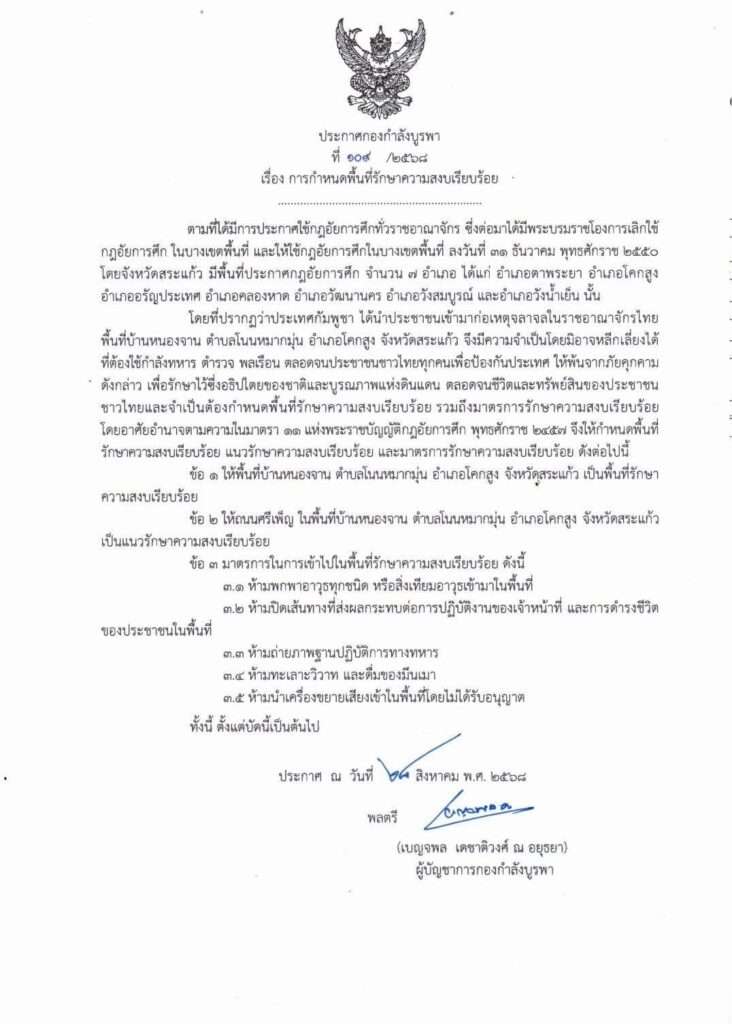 ทั้งนี้กองกำลังบูรพาขอความร่วมมือจากพี่น้องประชาชนทุกท่านในการปฏิบัติตามข้อกำหนด เพื่อให้เกิดความสงบเรียบร้อย ความปลอดภัย ในพื้นที่อธิปไตยของไทย ซึ่งหากต้องการข้อมูลเพิ่มเติม สามารถติดต่อได้ที่กองกำลังบูรพา อำเภอวัฒนานคร จังหวัดสระแก้ว