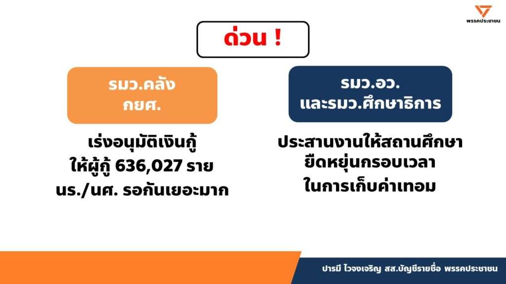ฝากท่านประธานประสานงานไปยัง 3 กระทรวงนี้อย่างเร่งด่วน เรื่อง กยศ. ตอนนี้เป็นเรื่องใหญ่มาก นักเรียนนักศึกษาเดือดร้อนกันทั่ว การศึกษาเป็นเรื่องสำคัญมากต่ออนาคตเยาวชนของชาติ ฝากท่านประธานประสานเร่งด่วนด้วย