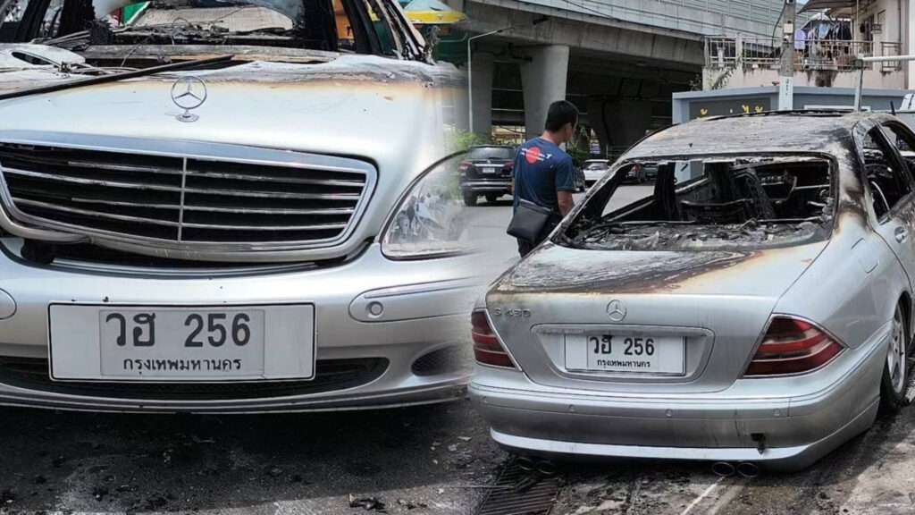 ที่เกิดเหตุบริเวณทางเข้าหมู่บ้านดังกล่าว พบรถยนต์เก๋งหรู ยี่ห้อเมอร์เซเดส-เบนซ์ สีบรอนซ์ หมายเลขทะเบียน วฮ 256 กทม. ถูกเพลิงลุกไหม้บริเวณห้องโดยสาร เสียหายเกือบทั้งคัน เบื้องต้นไม่มีผู้บาดเจ็บ ใช้เวลาประมาณ 30 นาที สามารถควบคุมเพลิงไว้ได้ทั้งหมด