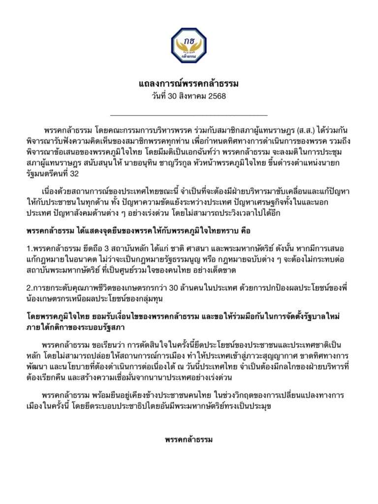กรุงเทพฯ, วันที่ 30 ส.ค. – จากกรณีที่ศาลรัฐธรรมนูญมีมติให้ น.ส.แพทองธาร ชินวัตร พ้นจากตำแหน่งนายกรัฐมนตรี ส่งผลให้รัฐมนตรีต้องพ้นไปด้วยทั้งคณะ และจะตั้งจัดตั้งรัฐบาลใหม่ ล่าสุดพรรคกล้าธรรมออกแถลงการณ์ ระบุว่าว่า คณะกรรมการบริหารพรรค ร่วมกับสมาชิกสภาผู้แทนราษฎร (ส.ส.) พิจารณารับฟังความคิดเห็นของสมาชิกพรรคทุกท่าน เพื่อกำหนดทิศทางการดำเนินการของพรรค รวมถึงพิจารณาข้อเสนอของพรรคภูมิใจไทย โดยมีมติเป็นเอกฉันท์ว่า พรรคกล้าธรรม จะลงมติในการประชุมสภาผู้แทนราษฎร สนับสนุนให้ นายอนุทิน ชาญวีรกูล หัวหน้าพรรคภูมิใจไทย ขึ้นดำรงตำแหน่งนายกรัฐมนตรีคนที่ 32