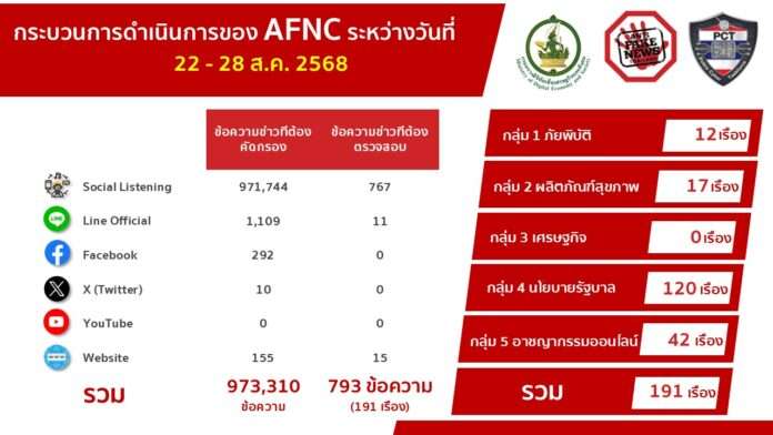กรุงเทพฯ วันที่ 30 ส.ค. – นายเวทางค์ พ่วงทรัพย์ เลขาธิการคณะกรรมการดิจิทัลเพื่อเศรษฐกิจและสังคมแห่งชาติ (BDE) ในฐานะโฆษกกระทรวงดิจิทัลเพื่อเศรษฐกิจและสังคม (ดีอี) กล่าวถึงผลการมอนิเตอร์และรับแจ้งข่าวปลอมของศูนย์ต่อต้านข่าวปลอม ระหว่างวันที่ 22 – 28 สิงหาคม 2568 พบข้อความที่เข้ามาทั้งหมด 973,310 ข้อความ โดยมีข้อความที่ต้องดำเนินการตรวจสอบ (Verify) ทั้งสิ้น 793 ข้อความ