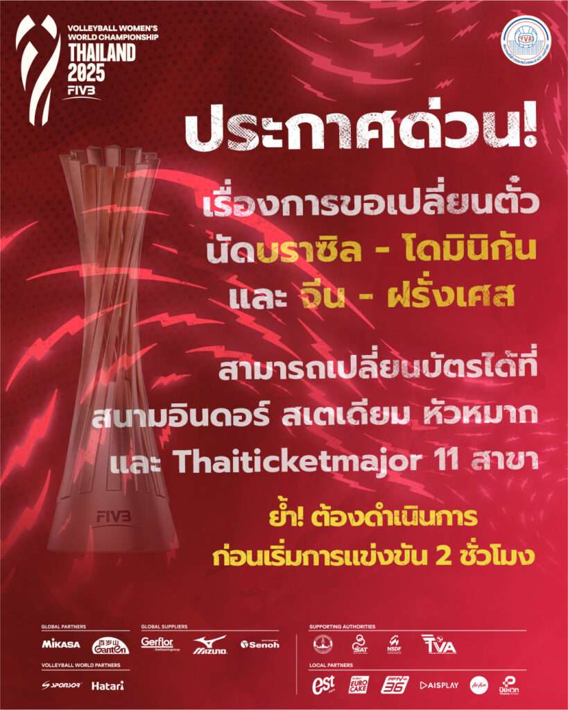 สมาคมฯ แจ้งผู้ถือตั๋วเข้าชมการแข่งขันวันที่ 31 สิงหาคม 2568 หากต้องการเปลี่ยนคู่แข่งขันที่เลือกไว้ ต้องติดต่อบูธ ThaiTicketMajor (TTM) 11 สาขาหลัก หรือที่หน้าสนามภายในเวลาที่กำหนดเท่านั้น เพื่อความสะดวกในการเข้าชมทั้งคู่บราซิล–โดมินิกัน (20:30 น.) และ จีน–ฝรั่งเศส (17:00 น.)