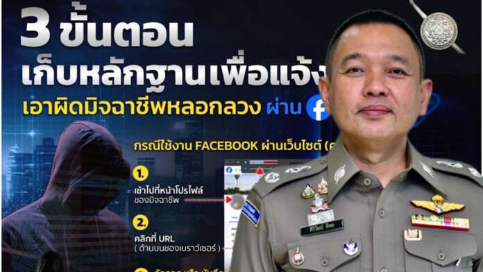 เปิดเผยว่า พล.ต.อ.กิตติ์รัฐ พันธุ์เพ็ชร์ ผู้บัญชาการตำรวจแห่งชาติ (ผบ.ตร.) มีความห่วงใยประชาชนที่อาจได้รับความเสียหายจากอาชญากรรมทางเทคโนโลยี โดยเฉพาะการหลอกลวงผ่านสื่อสังคมออนไลน์ เช่น เฟซบุ๊ก ซึ่งจากสถิติการรับแจ้งความออนไลน์พบว่า มิจฉาชีพนิยมใช้เฟซบุ๊กเป็นช่องทางหลักในการก่อเหตุ เพื่อให้ประชาชนสามารถเก็บข้อมูลพยานหลักฐานเกี่ยวกับบัญชีเฟซบุ๊กของมิจฉาชีพ ที่ถูกต้อง ครบถ้วน และสามารถนำไปใช้ในการแจ้งความดำเนินคดีได้