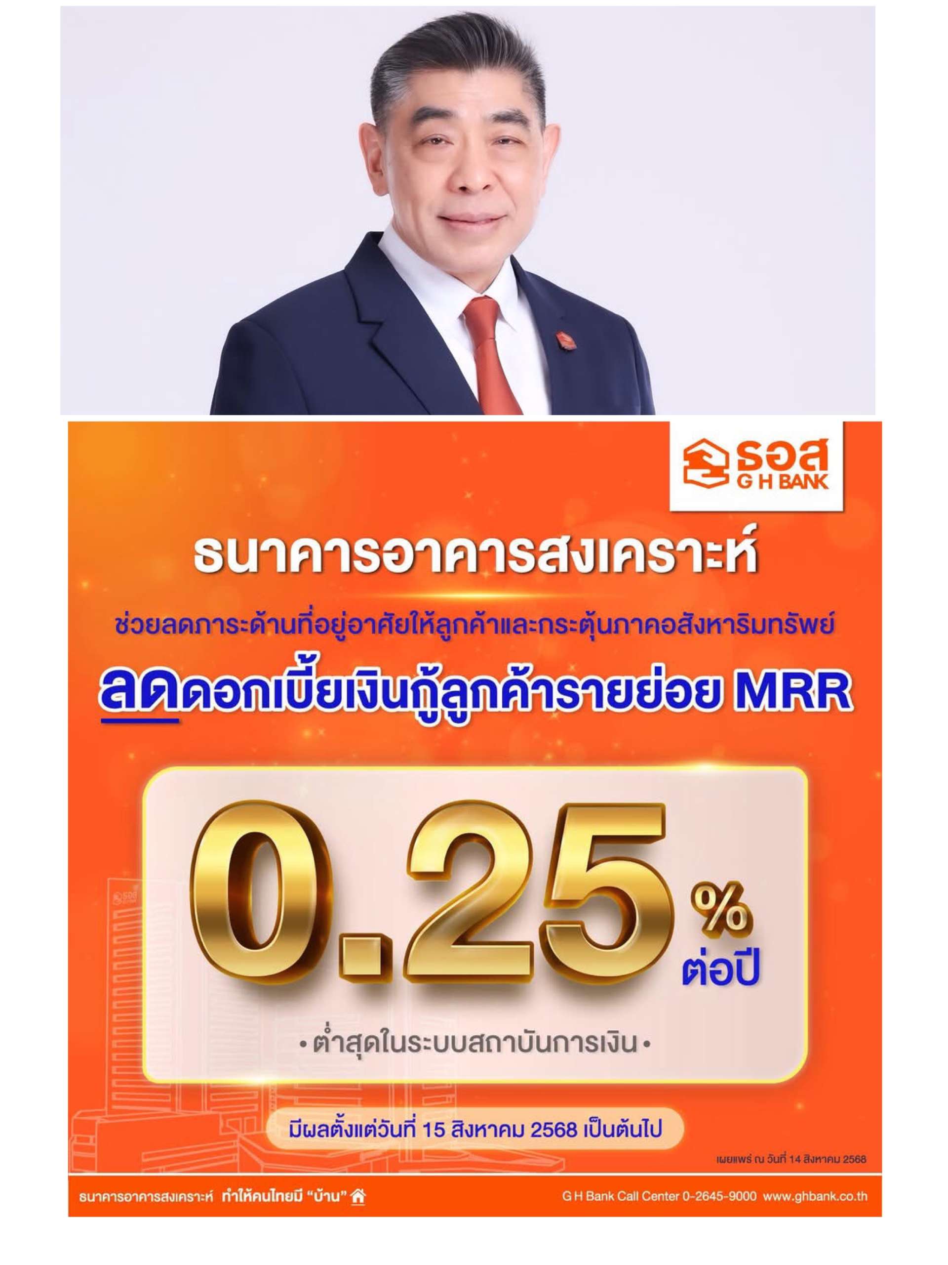 นายกมลภพ วีระพละ กรรมการผู้จัดการธนาคารอาคารสงเคราะห์ (ธอส.) เปิดเผยว่า ตามที่คณะกรรมการนโยบายการเงิน (กนง.) มีมติปรับลดอัตราดอกเบี้ยนโยบาย 0.25% ต่อปี จาก 1.75% ต่อปี เป็น 1.50% ต่อปี เมื่อวันที่ 13 สิงหาคม 2568 ธอส. พร้อมเป็นส่วนหนึ่งในการช่วยลดภาระด้านที่อยู่อาศัยให้ลูกค้าและขับเคลื่อนภาคอสังหาริมทรัพย์ของประเทศ จึงปรับลดอัตราดอกเบี้ยเงินกู้ลูกค้ารายย่อยชั้นดี (MRR) 0.25% ต่อปี จากปัจจุบัน 6.495% ต่อปี เป็น 6.245% ต่อปี โดยให้มีผลตั้งแต่วันที่ 15 สิงหาคม 2568 เป็นต้นไป ส่งผลให้ปัจจุบันอัตราดอกเบี้ย MRR ของ ธอส. ยังคงอยู่ในระดับต่ำสุดเมื่อเทียบกับธนาคารพาณิชย์และสถาบันการเงินของรัฐอื่น