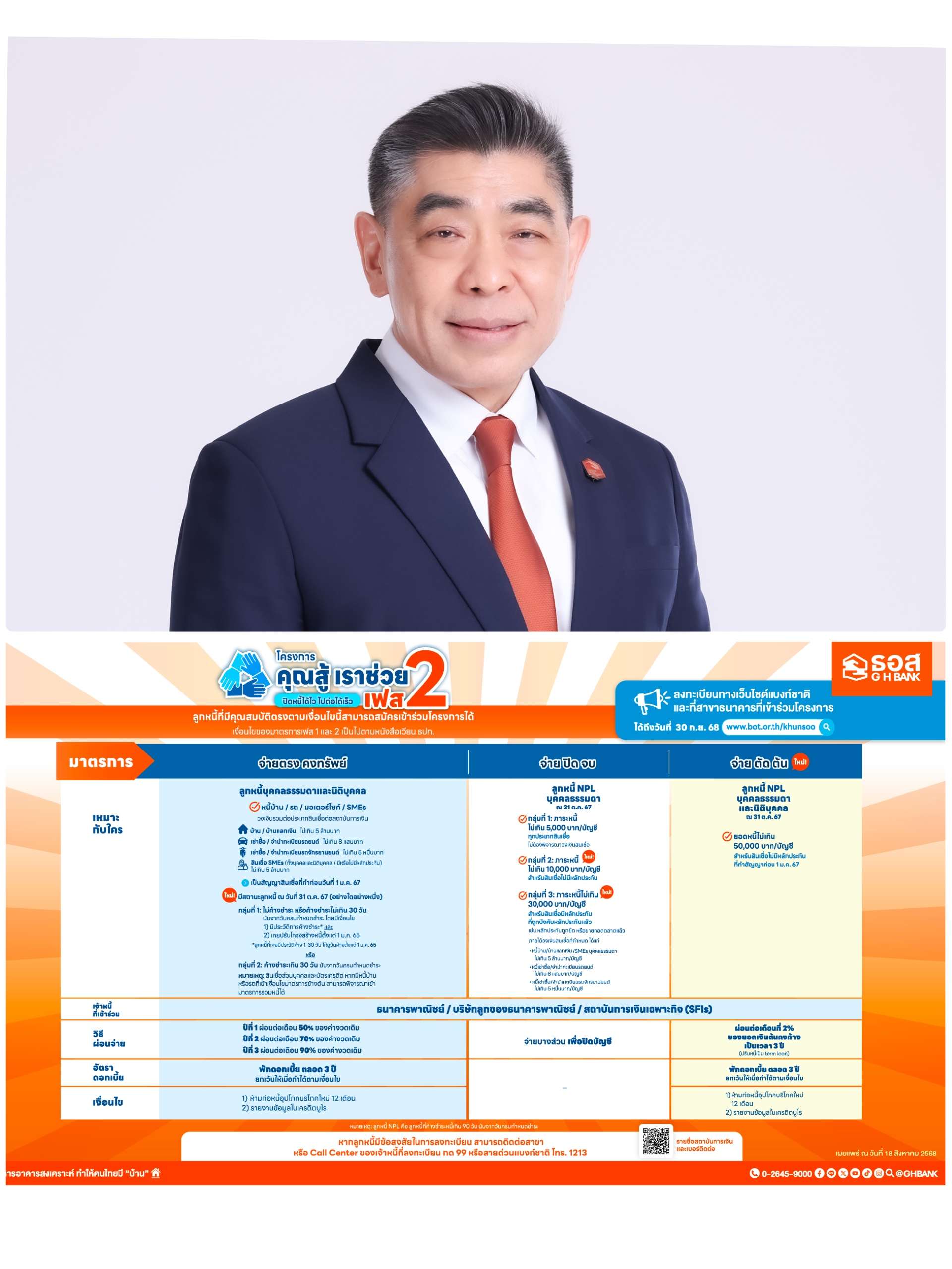 ธนาคารอาคารสงเคราะห์ (ธอส.) เดินหน้าสานต่อโครงการคุณสู้ เราช่วยเฟส 2 เพิ่มคุณสมบัติให้ลูกค้าสามารถเข้าร่วมโครงการได้ครอบคลุมมากขึ้น พร้อมขยายระยะเวลาลงทะเบียนถึงวันที่ 30 กันยายน 2568หลังมีลูกค้าเข้าร่วมโครงการในเฟสแรกแล้วกว่า 97,000 บัญชี ผู้ที่สนใจสามารถลงทะเบียนได้ทางเว็บไซต์ธนาคารแห่งประเทศไทยwww.bot.or.th/Khunsoo หรือ แอปพลิเคชัน GHB ALL GEN และแอปพลิเคชัน GHB ALL BFRIEND