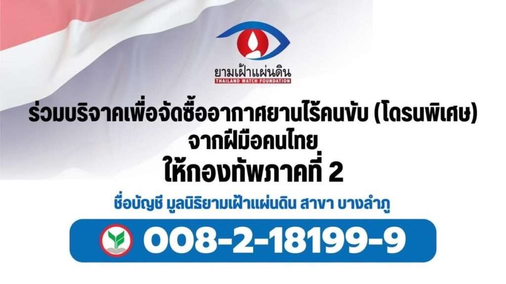 มูลนิธิยามเฝ้าแผ่นดินจึงกราบเรียนมาเพื่อแจ้งต่อพี่น้องประชาชนให้ทราบในโครงการดังกล่าวโดยท่านที่สนใจสามารถเข้าร่วมบริจาคโครงการเพื่อจัดซื้อแอนตี้โดรนไทย ให้กับกองทัพภาคที่สอง ได้ที่