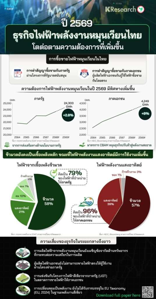 กรุงเทพฯ วันที่ 3 ก.ย. – ศูนย์วิจัยกสิกรไทยคาดการณ์ความต้องการรับซื้อไฟฟ้าพลังงานหมุนเวียนในปี 2569 ว่ามีทิศทางเพิ่มสูงขึ้นทั้งจากภาครัฐ และภาคเอกชน โดยปริมาณไฟฟ้าพลังงานหมุนเวียนที่ขายให้ภาครัฐคาดว่าจะอยู่ที่ 24,303 GWh และภาคเอกชนคาดว่าจะอยู่ที่ 4,249 GWh เพิ่มขึ้น 2.8% และ 8% ตามลำดับ
