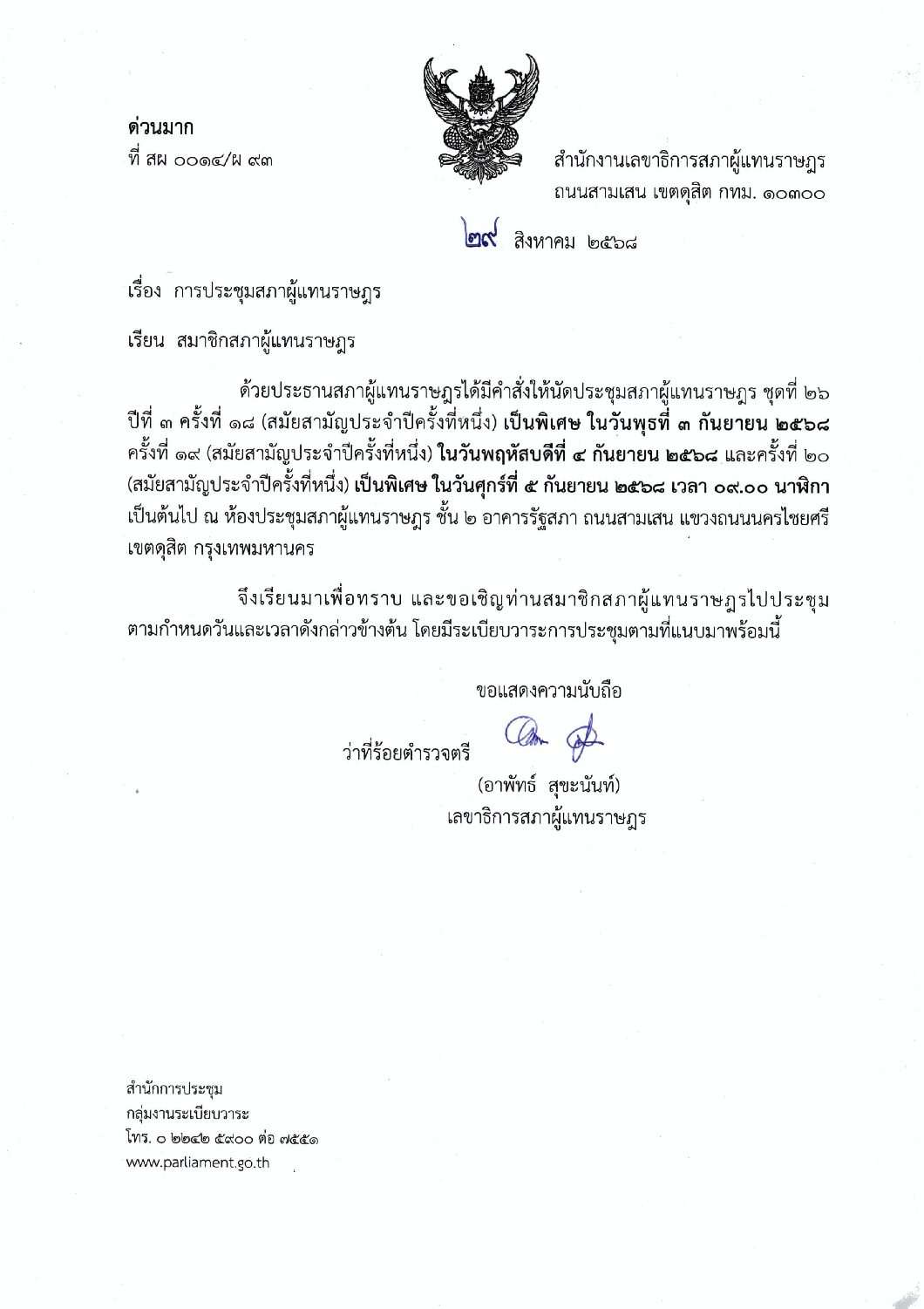 นายวันมูหะมัดนอร์ มะทา ประธานสภาผู้แทนราษฎร ได้มีคำสั่งให้บรรจุเรื่องตามระเบียบวาระเรื่องด่วนที่ 8 พิจารณาให้ความเห็นชอบบุคคลซึ่งสมควรได้รับแต่งตั้งเป็นนายกรัฐมนตรี ตามมาตรา 159 ของรัฐธรรมนูญแห่งราชอาณาจักรไทย เพิ่มเติม ในการประชุมสภาผู้แทนราษฎร ชุดที่ 26 ปีที่ 3 ครั้งที่ 20 (สมัยสามัญประจำปีครั้งที่หนึ่ง) เป็นพิเศษ ในวันศุกร์ที่ 5 กันยายน 2568